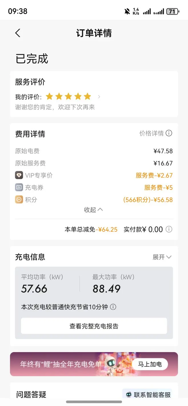 最后结算的时候还有优惠券可以使用,用积分支付,这是鹏友独有的充电优惠,每次到小鹏超充站心情都格外的美丽,然后就是最后返程啦!