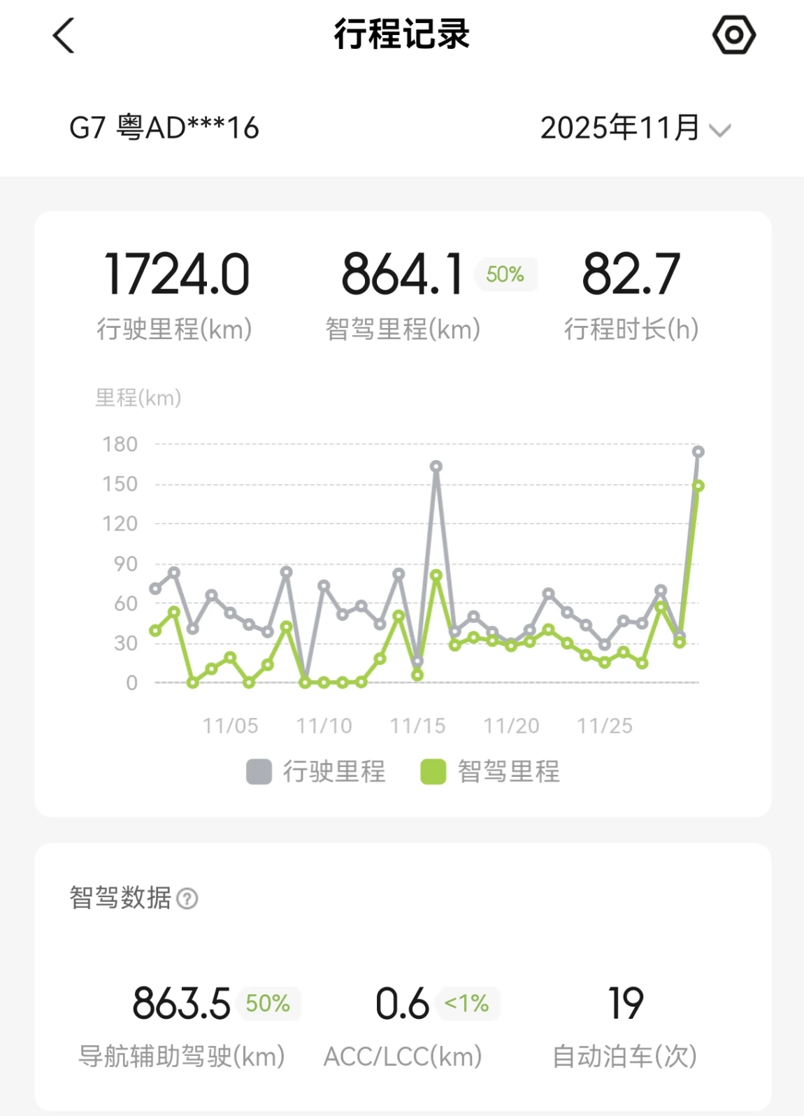 大家好,我是G7车主。进入11月,广州天气转凉,正是测试电动车能耗的好时机。这个月我开着G7跑了将近1800公里,既穿梭于市中心,也去了花都、增城等郊区,顺便记录了一下车辆在真实用车场景下的能耗表现。下面和大家分享一下我的数据和体会,供各位参考。