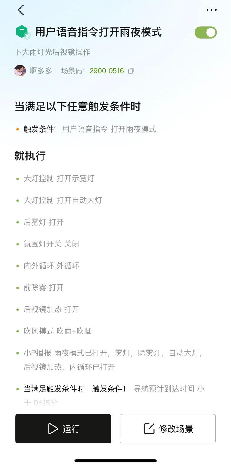 之前下雨时,总记不清该开哪些灯光和功能,手忙脚乱调按键还影响驾驶安全。现在我给P7+设置了「雨夜模式」,只要喊一句“小P,打开雨夜模式”,车辆就会自动执行一系列操作:开启示宽灯、自动大灯、后雾灯,关闭氛围灯,切换外循环并打开前除雾和后视镜加热,小P还会实时播报操作内容。