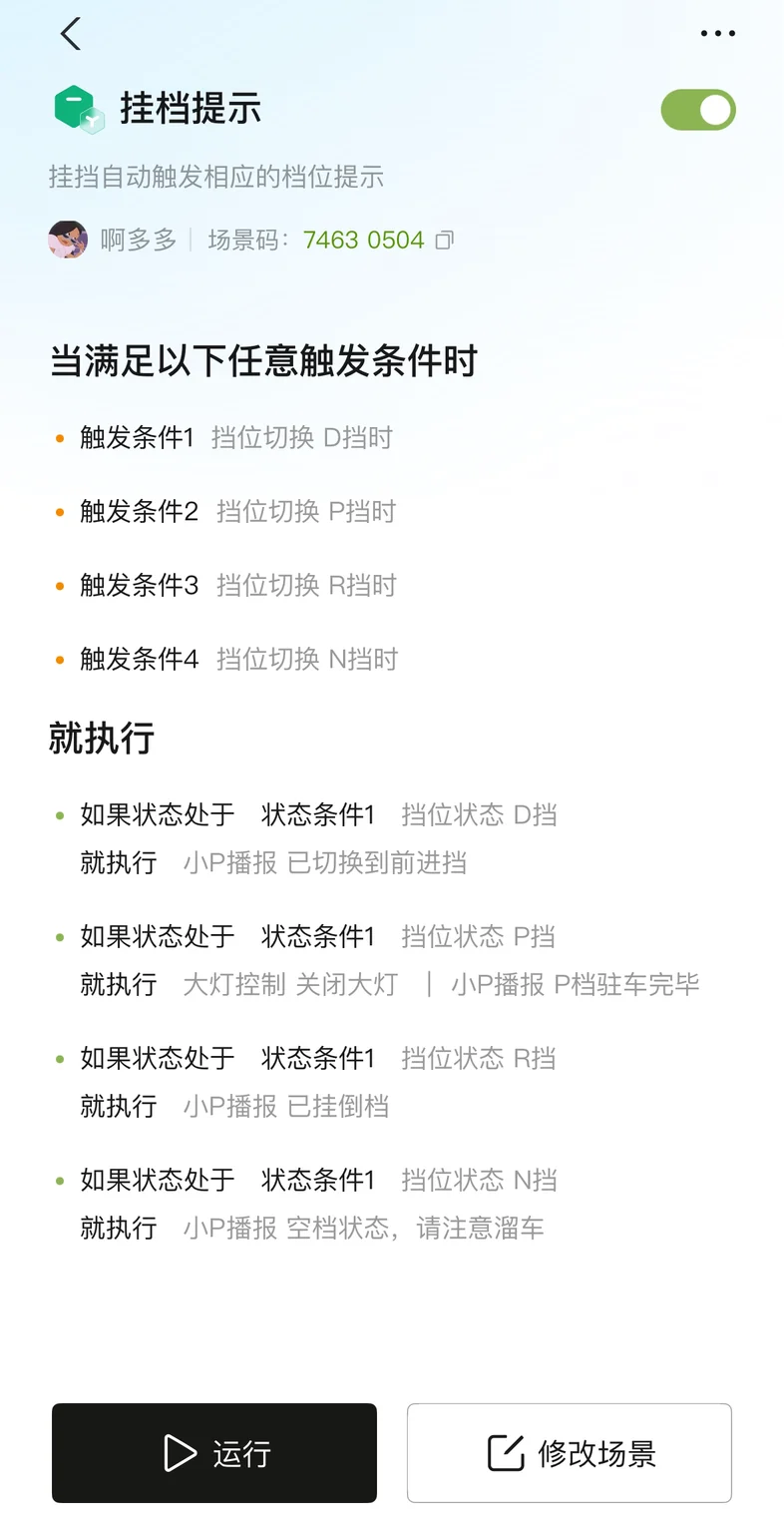 曾看到过不少因记错挡位引发的碰撞事故,就给P7+定制了「挂挡提示」场景。切换D/P/R/N任一挡位时,小P都会立刻语音播报挡位状态;挂入P挡时,还会自动关闭大灯。