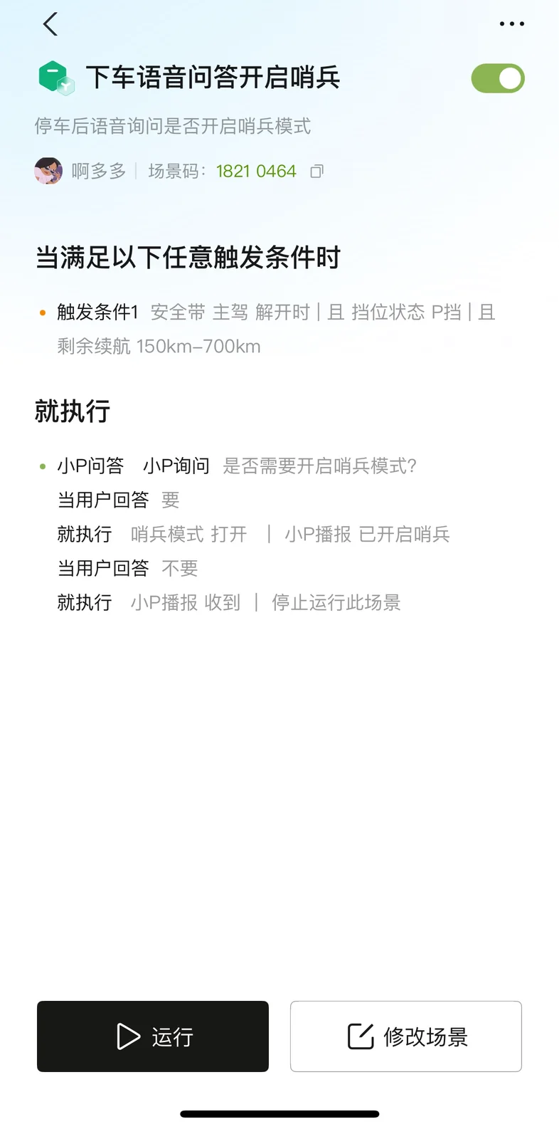 于是我设置了「下车询问哨兵模式」场景:解开主驾安全带+挂入P挡时,小P会主动语音询问是否开启哨兵模式,我只需口头回应“要”或“不要”即可。既保证了陌生环境下的车辆安全,又不会在熟悉区域无故耗电,对小鹏P7+的续航把控也更精准了。