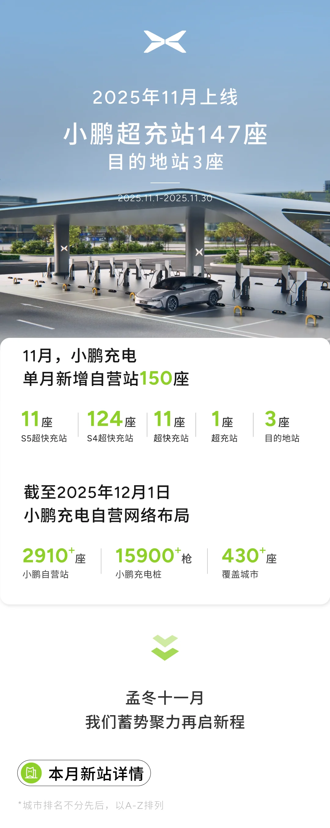 小鹏充电新站上线|2025年11月上线小鹏超充站147座,目的地站3座