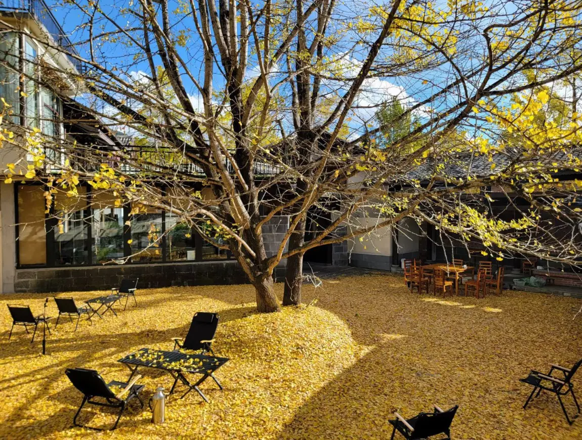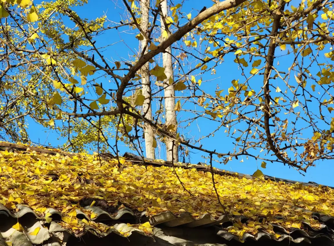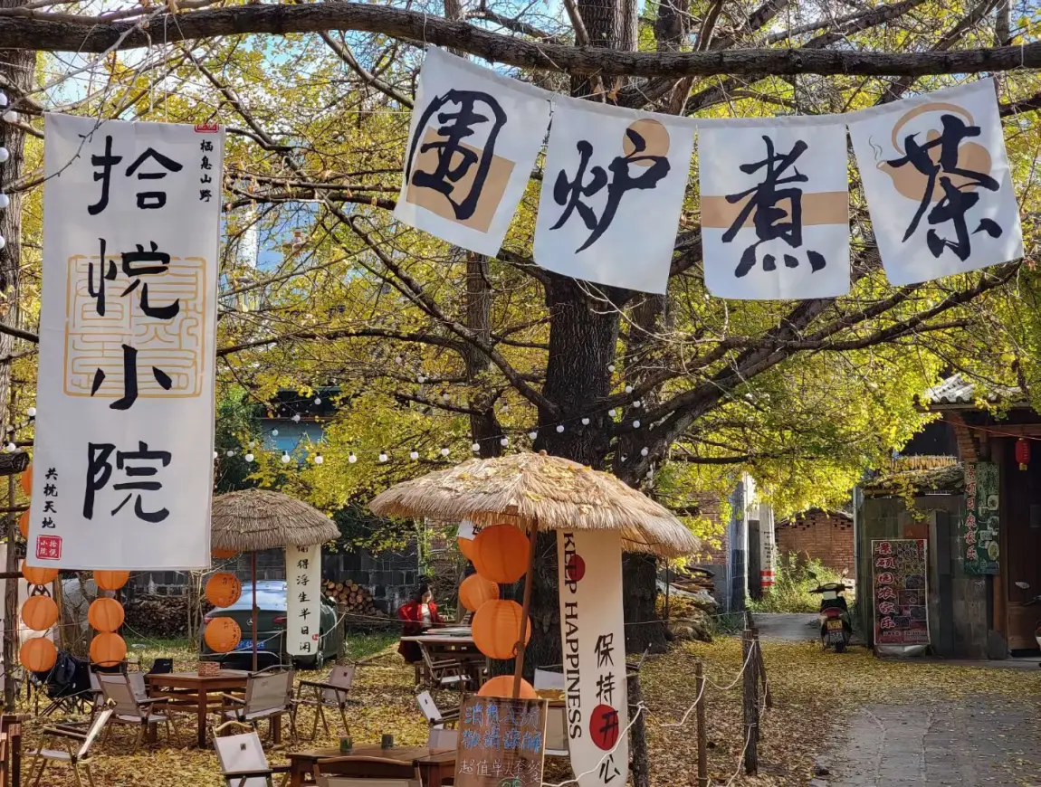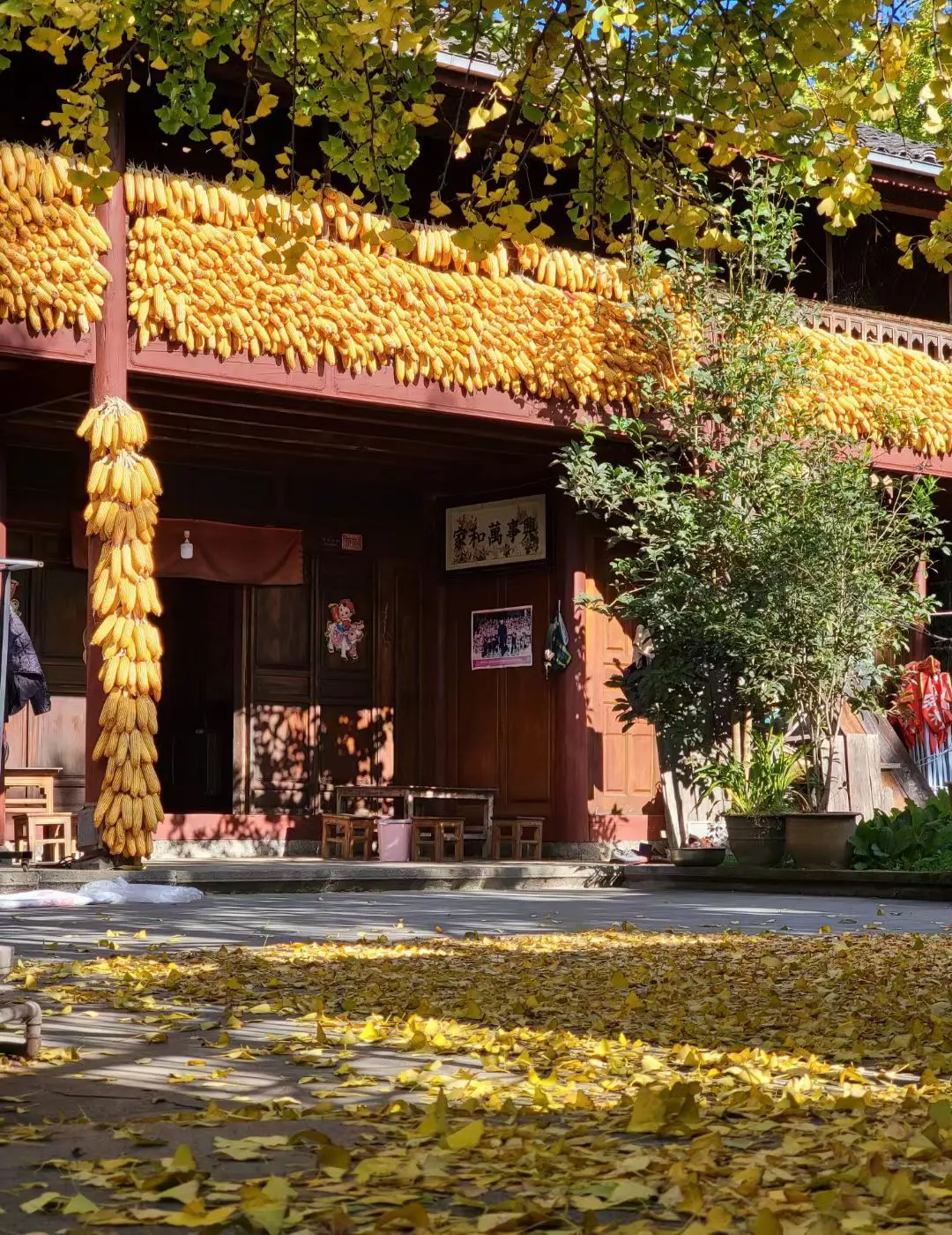 驶入银杏村时,晨雾还未散尽。百年古树披着薄纱般的雾气,枝头金叶簌簌飘落,像一场无声的慢镜头。踩着松软的“落叶毯”往深处走,火山石砌的矮墙爬满青苔,老屋檐角挑着几串红灯笼,与满地金黄撞出暖融融的烟火气。