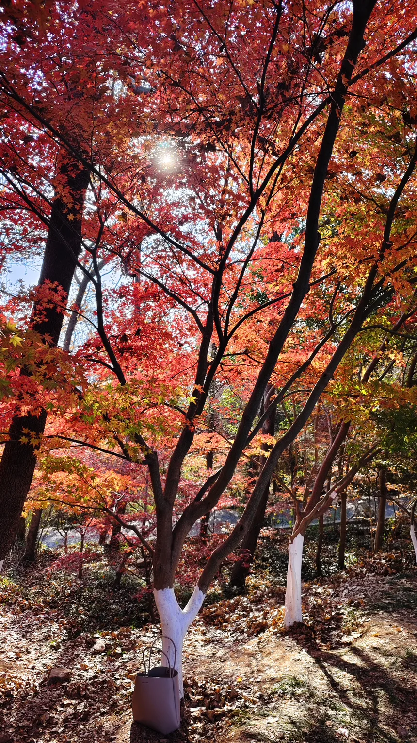 不到两小时就抵山,此刻的栖霞山早已被红叶染透,85%的枫叶红得正盛。我们选了不费脚的亲子路线,从西门进先到彩虹明镜湖,湖面倒映着红枫和湖心亭,娃追着湖里的小鱼跑,爸妈则在湖边拍个不停,阳光穿过枫叶洒在身上,暖融融的格外舒服。沿着平缓的栈道往上走,红叶谷的景色让人眼前一亮,暗红、艳红的枫叶层层叠叠,像是打翻了调色盘,全家捡了好多形状别致的枫叶,准备回家做书签。