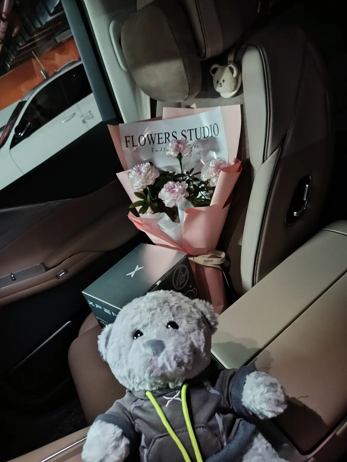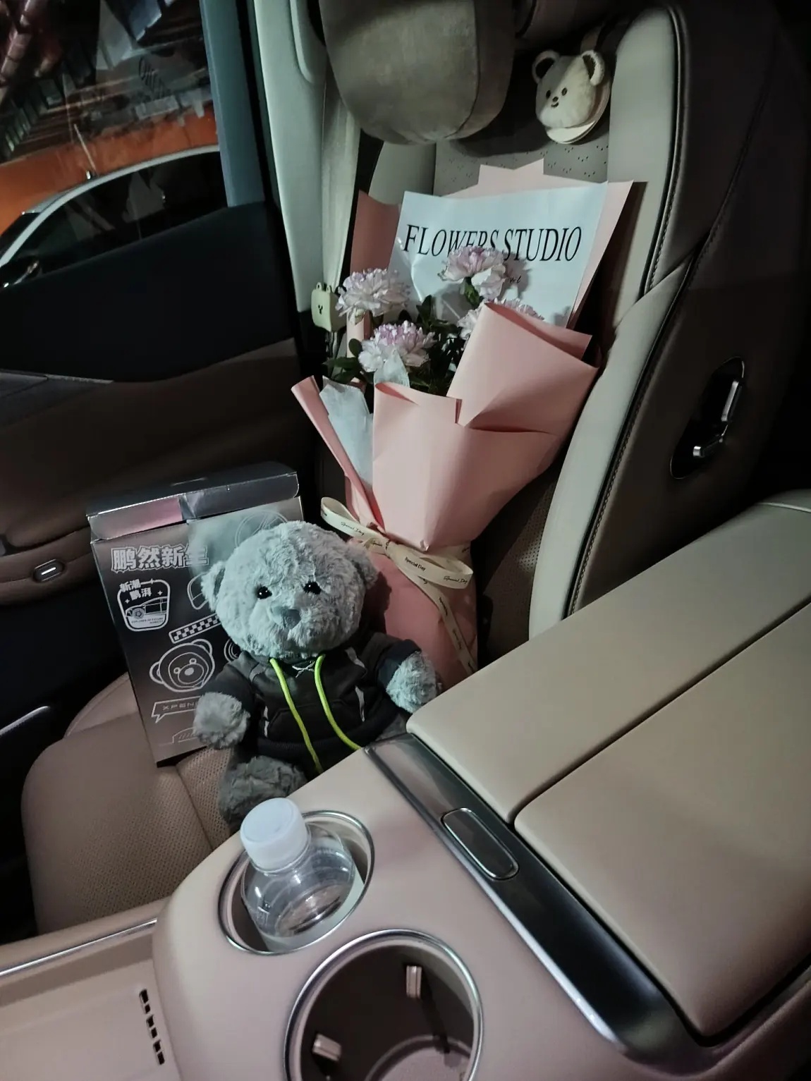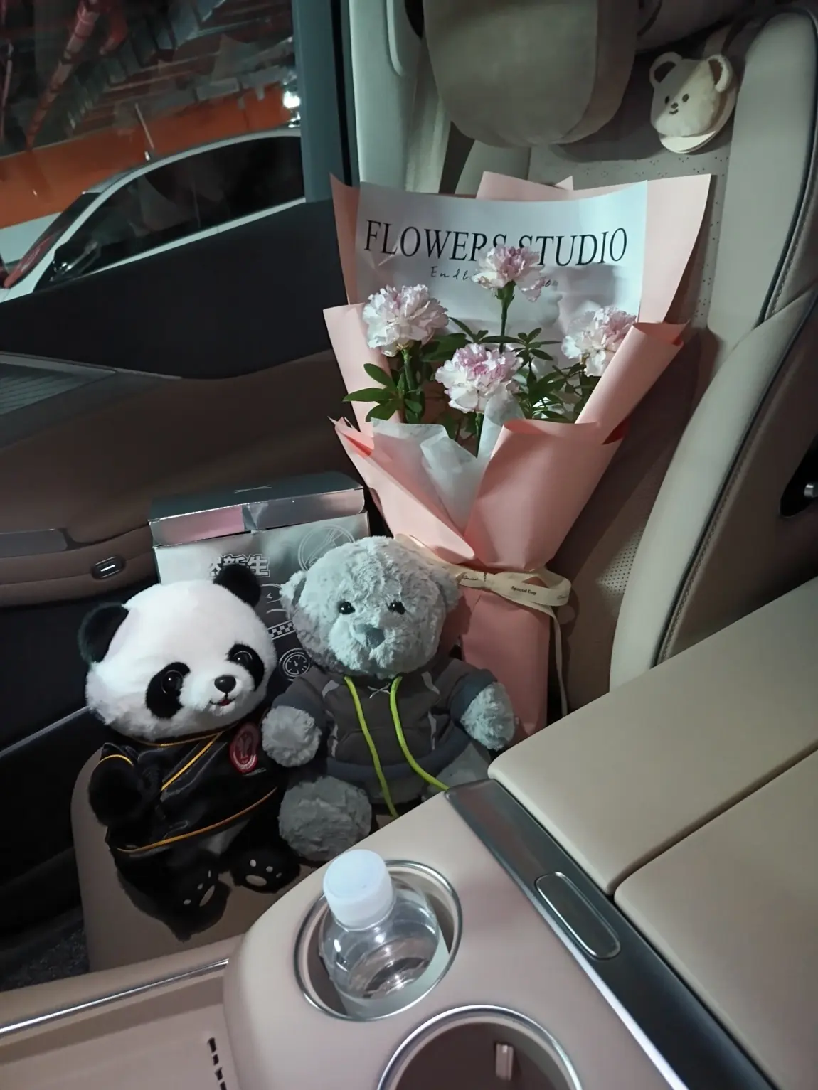 二排零重力太舒服了,家人一上车都去坐二排,副驾就空出来啦,提车鲜花和鹏厂小熊,还有可爱的熊猫。