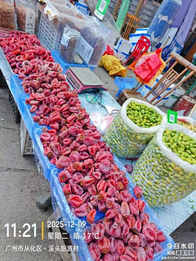 到村头已是近午,先被巷口的市集勾了魂:竹筐里堆着裹着白霜的柿饼,甜香裹着山风往鼻子里钻;竹制的杯子、小摆件带着草木的纹路,随手摸一把都是清清凉凉的质感。没忍住买了袋柿饼揣兜里,边走边啃,软甜的果肉裹着阳光,连脚步都轻了起来。