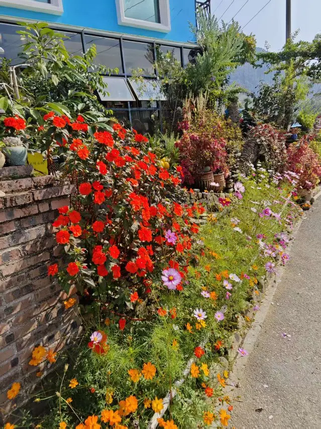 拐进民宿时直接愣了神:蓝白相间的小楼爬满了花,三角梅红得像把火,格桑花在路边铺成粉紫的云,连墙角的石缝里都钻着嫩黄的小野花。坐在窗边喝茶时,山景顺着玻璃淌进来,风裹着草木香往杯子里落,一口茶下去,连肺里都是清清爽爽的甜。