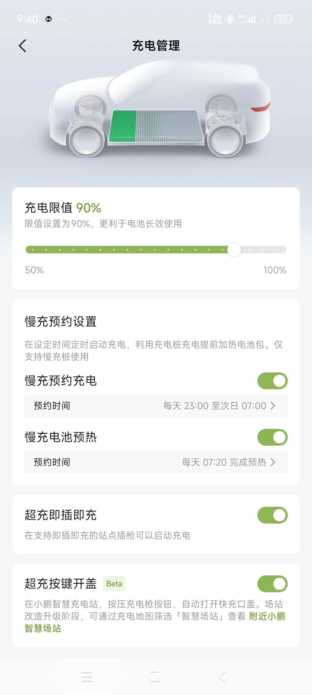 这时我们可以开启小鹏的智能导航预加热,当我们导航到小鹏超冲桩充电时,车子就可以提前对电池进行预加热,等到充电时,就可以更快速的充电