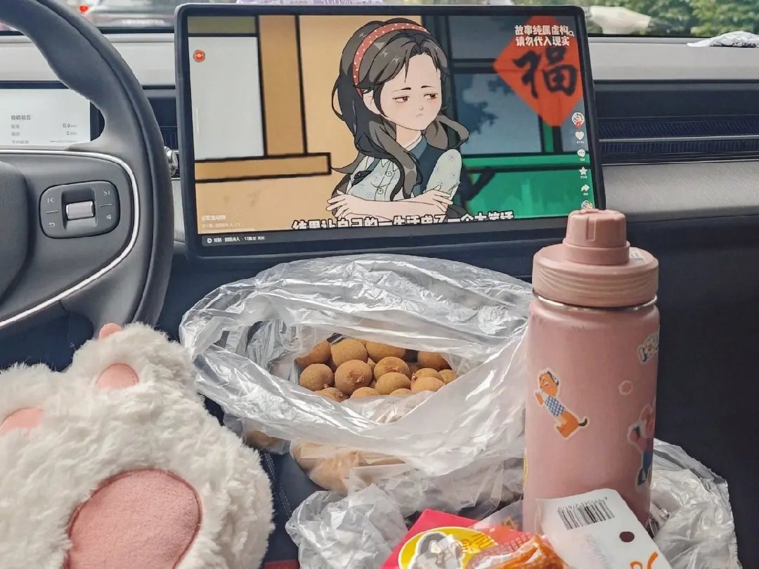 副驾本是我和女儿的专属宝座,现在她扎进课堂充电时,这儿就成了我的“单人治愈区”:屏幕放着软乎乎的抖音动画,手边堆着刚薅的龙眼+零食,猫爪垫一靠,连等待都裹着甜滋滋的松弛感~