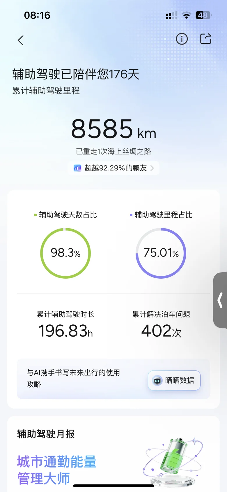今年累计跑了11000+公里,智驾里程占了大部分时间!高速上解放双脚的松弛感,是我今年最爱的“出行小确幸”。平均能耗一直稳在15.2kWh/100km,夏天满电跑个400+公里完全不用慌,露营外放电煮火锅那次,朋友都夸它是“移动的快乐电源”。