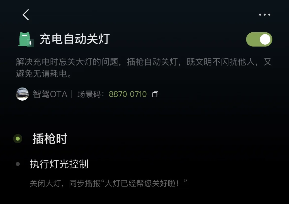 解决充电时忘关大灯的问题,插枪自动关灯,既文明不闪扰他人,又避免无谓耗电。