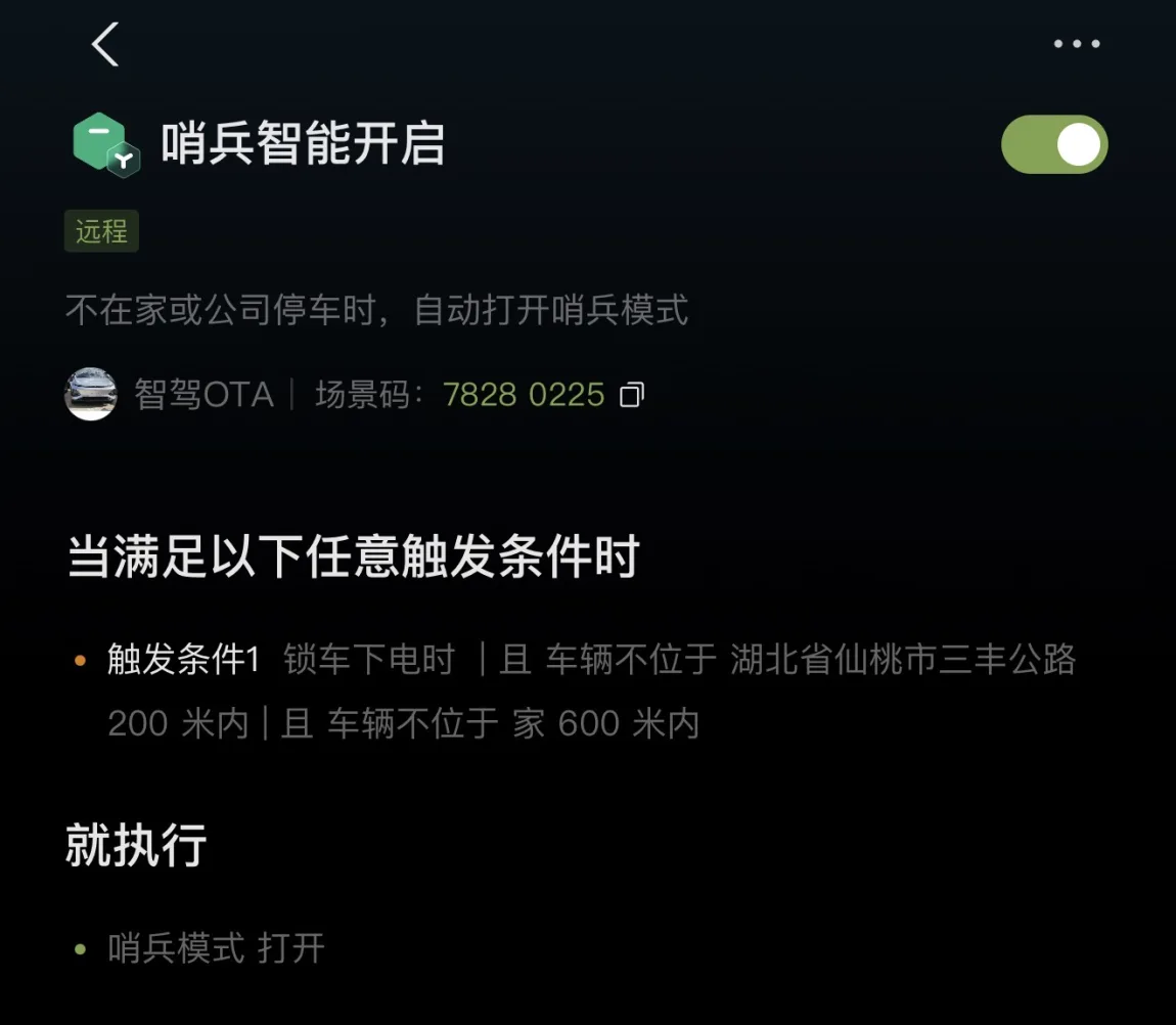不在家或公司停车时,自动打开哨兵模式。要在地图中加入公司和家的定位。