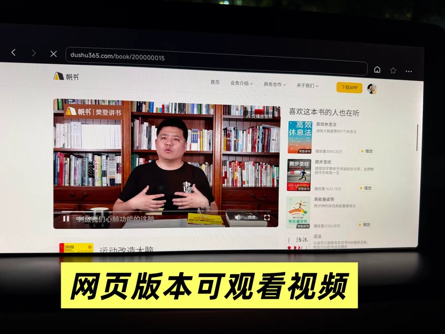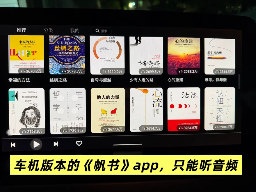 帆书也是之前的樊登读书会,在车机上有app,但是听音频,不能看视频。毕竟有些内容需要看到字幕才能get得到意思。