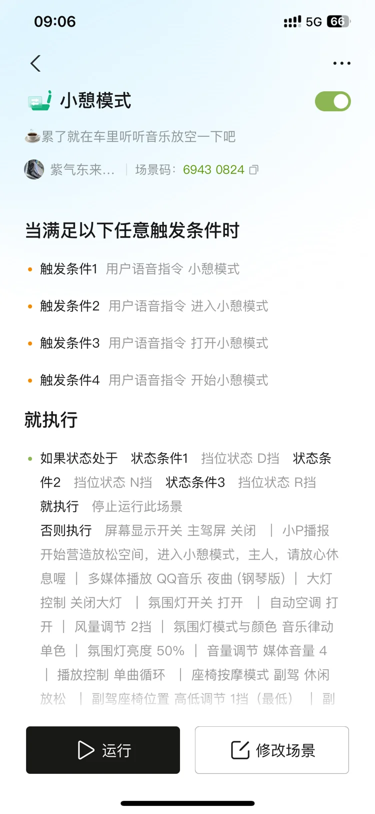 我特意把场景设置成了副驾专属,其实主驾也能轻松修改,几步操作就能适配自己的习惯,灵活又方便(场景码69430824,大家需要的话可以添加进去)。除了小憩模式,小鹏还有充电自动躺平、冬季自动开暖风等超多实用场景,每一个都精准戳中日常需求,好玩又好⽤,真正把智能融入了细节里。