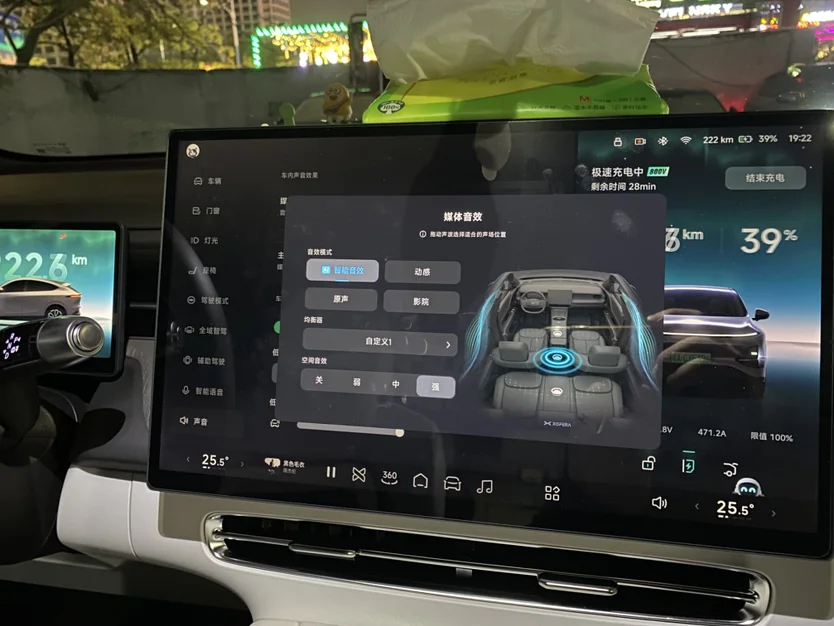 第二,AI智能音效,我的是2025款G6 725超长续航Max旗舰版,18个扬声器,搭配大师调音与全栈自研音效算法,随时随地享受高品质音乐,特别是晚上氛围灯随着音乐变换,太惊艳