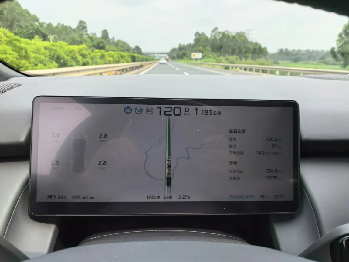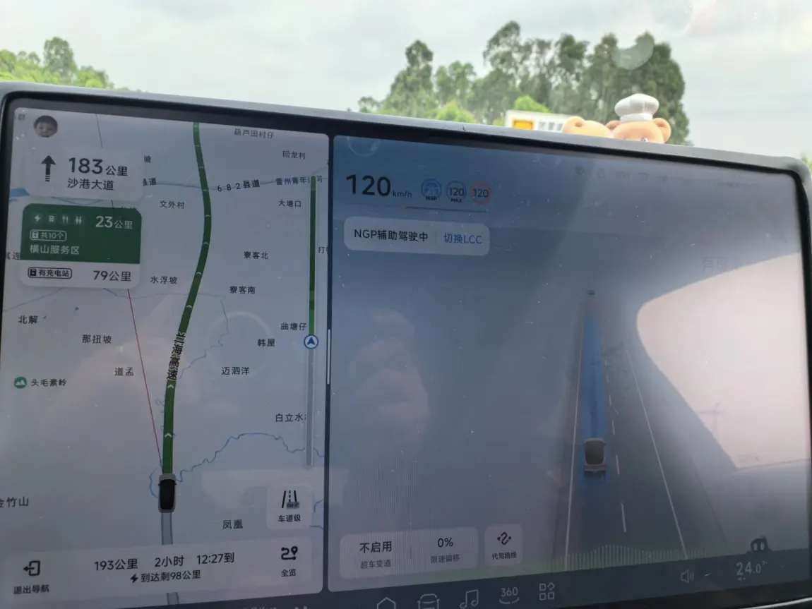 事实证明,我的底气从不是空谈。第一站阳江到崇左汉庭酒店,500多公里的路程,我全程开着NGP智驾,高速稳稳保持120km/h,电耗仅14左右。为了稳妥起见,我在钦州西服务区充了20块钱的电——不过是上个厕所的功夫,就能继续出发。等我抵达崇左,精神头依旧十足,还能出门溜达物色吃晚饭的地方,而我的油车朋友们早已累得倒在床上呼呼大睡,嘴里还念叨着“开500多公里太累了”。我笑着调侃:“这下知道小鹏智驾的厉害了吧!”