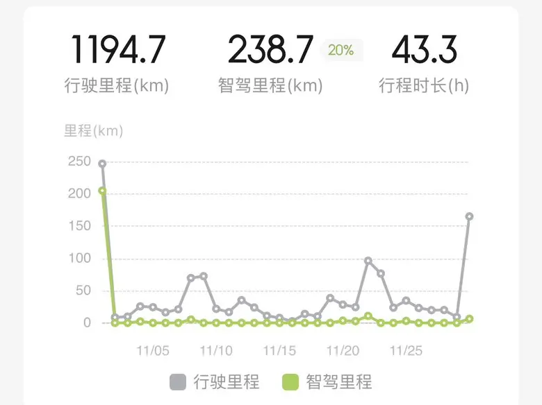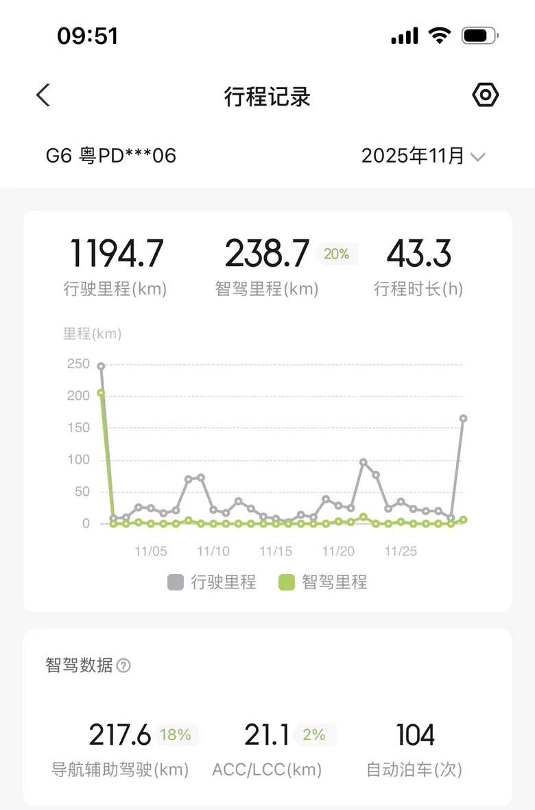 11月攥着G6的方向盘跑了1194.7公里,转头一看智驾里程——238.7公里。导航辅助驾驶就啃下217.6公里,高速上往座椅里一靠,双手往腿上一搭的松弛感,谁开谁知道。更别说自动泊车那104次出场,窄到后视镜都快贴墙的车位,它愣是一把怼进去,这技能简直是停车困难户的速效救心丸。