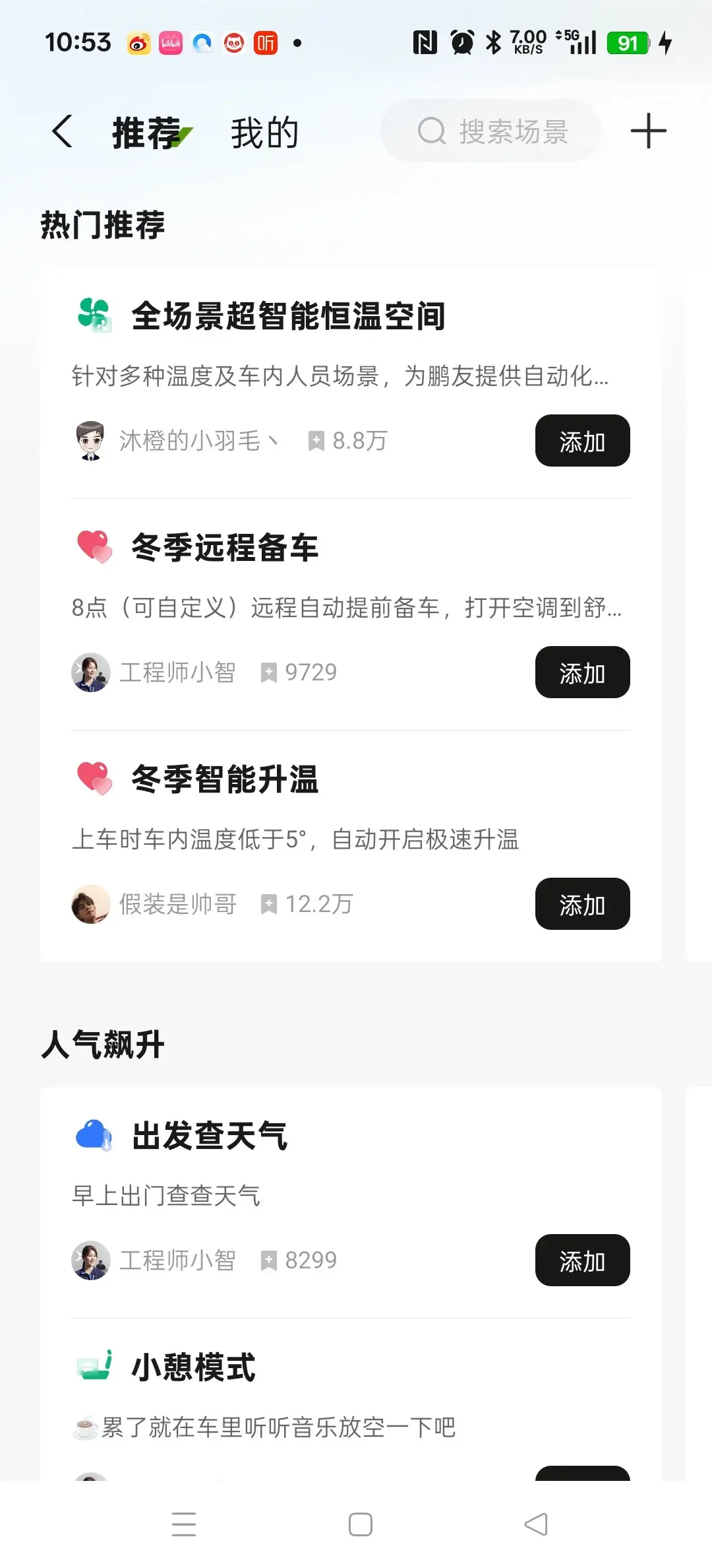 2.优化“场景广场”: 在车机和App内打造活跃的“场景广场”,方便鹏友一键浏览、搜索、分类(如“安全”、“舒适”、“节能”、“带娃”、“宠物”等)、评分、收藏和直接应用他人分享的场景。让好场景流动起来!
