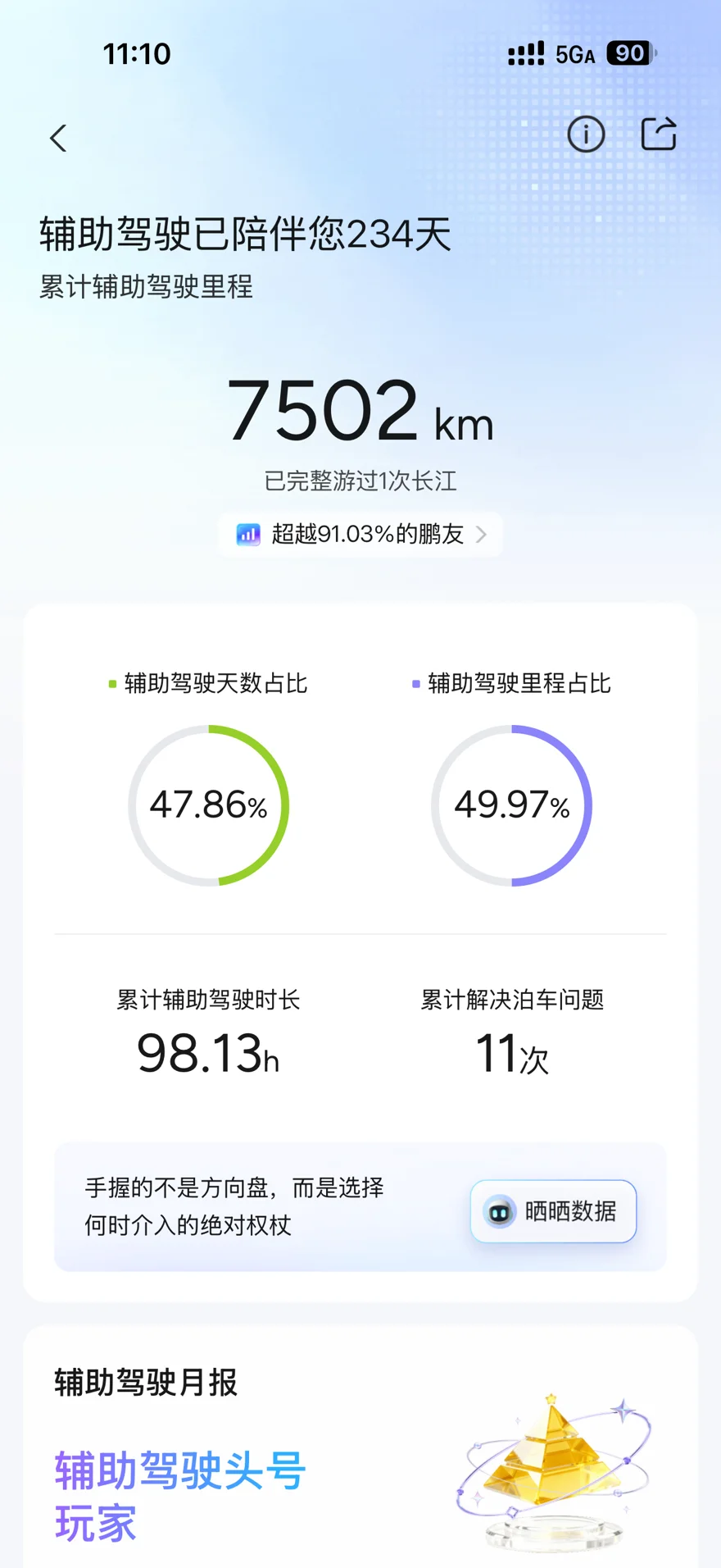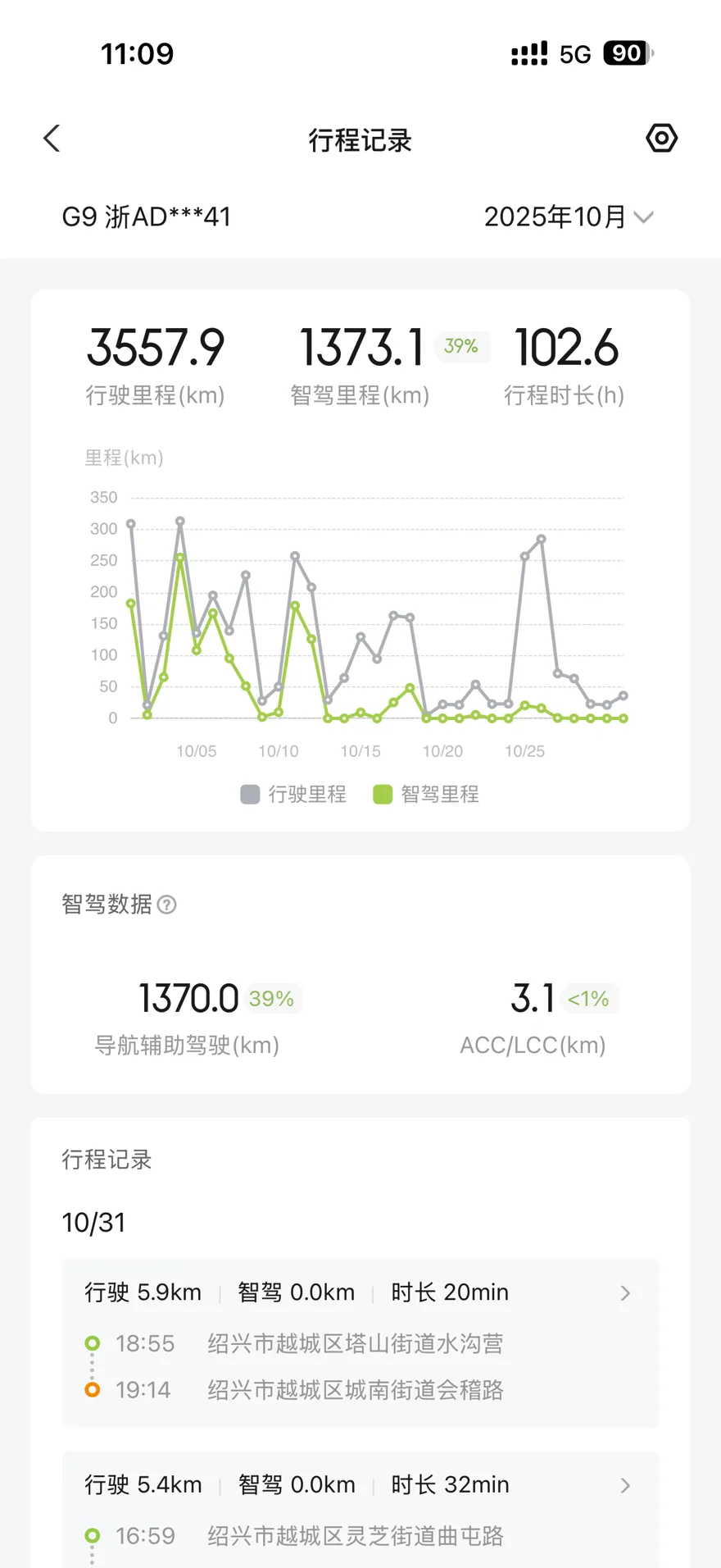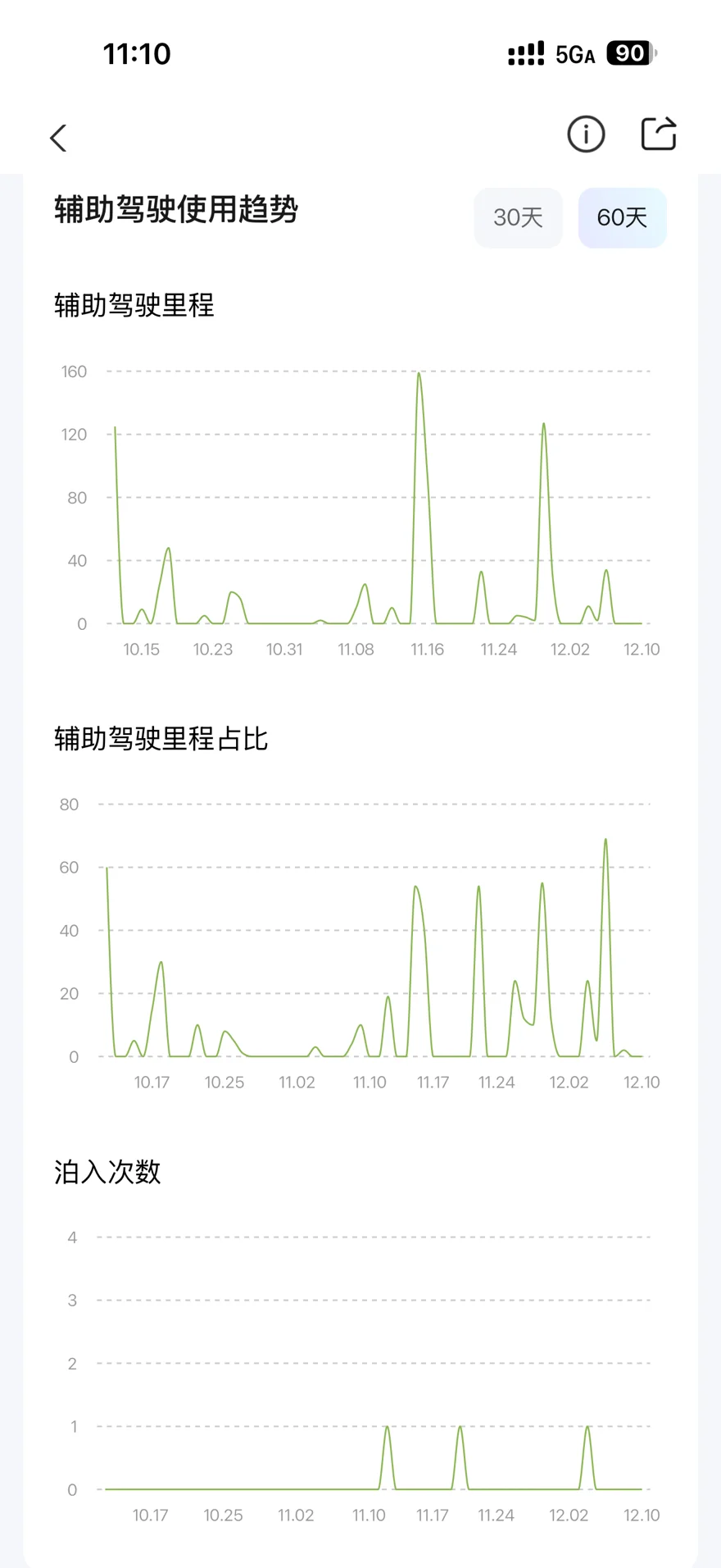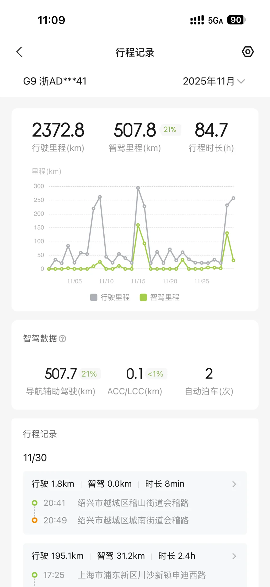智能辅助驾驶使用在50%左右吧,主要在高架快速路和高速上使用,城区一般自己开会更灵活,效率更高,主要还是防止别人插队哈哈。