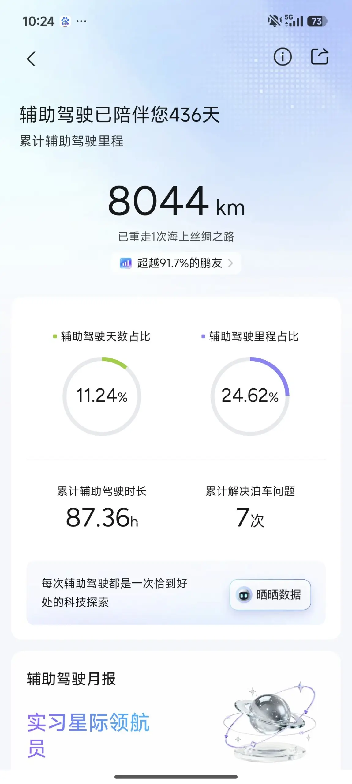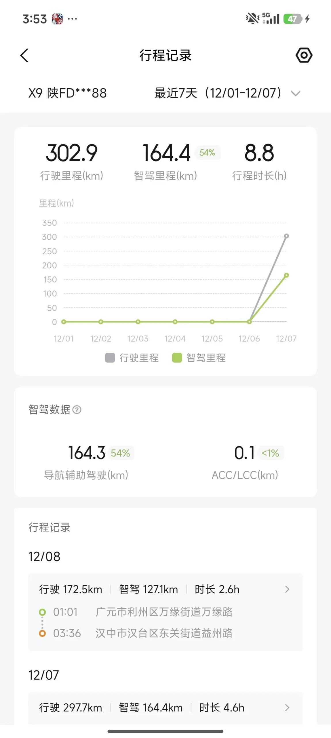 先甩一组硬核数据:累计辅助驾驶里程8044km,相当于重走了一趟海上丝绸之路,智驾时长飙到87.36小时,直接超越91.7%的鹏友(偷偷骄傲)。单看12月那趟成都→广元→汉中的长途,297.7km的路程里智驾占了164.4km,平均车速74.6km/h,百公里能耗才18.1kWh——高速上开着NGP,我只负责吃零食看阿尼亚,这“甩手掌柜”当得不要太爽。