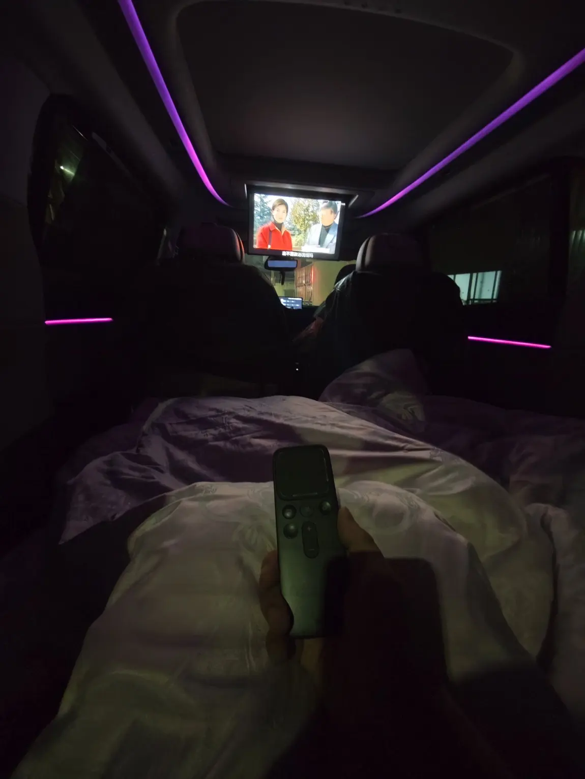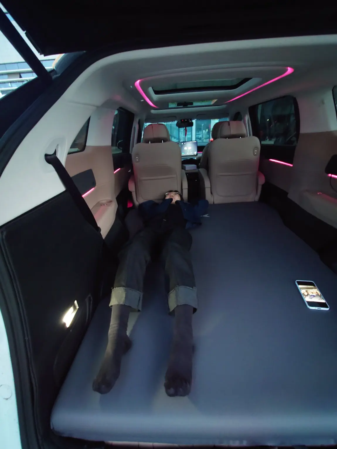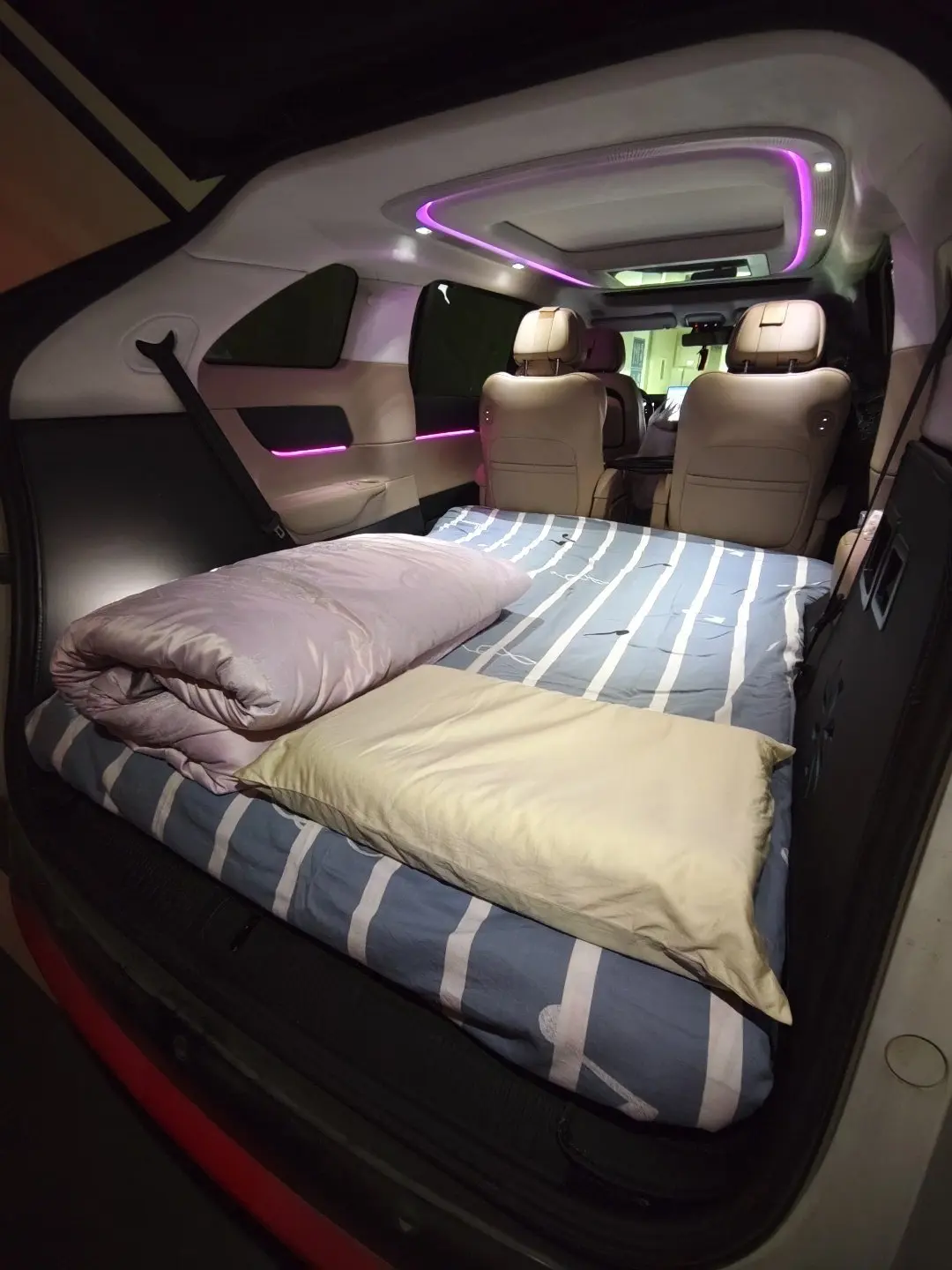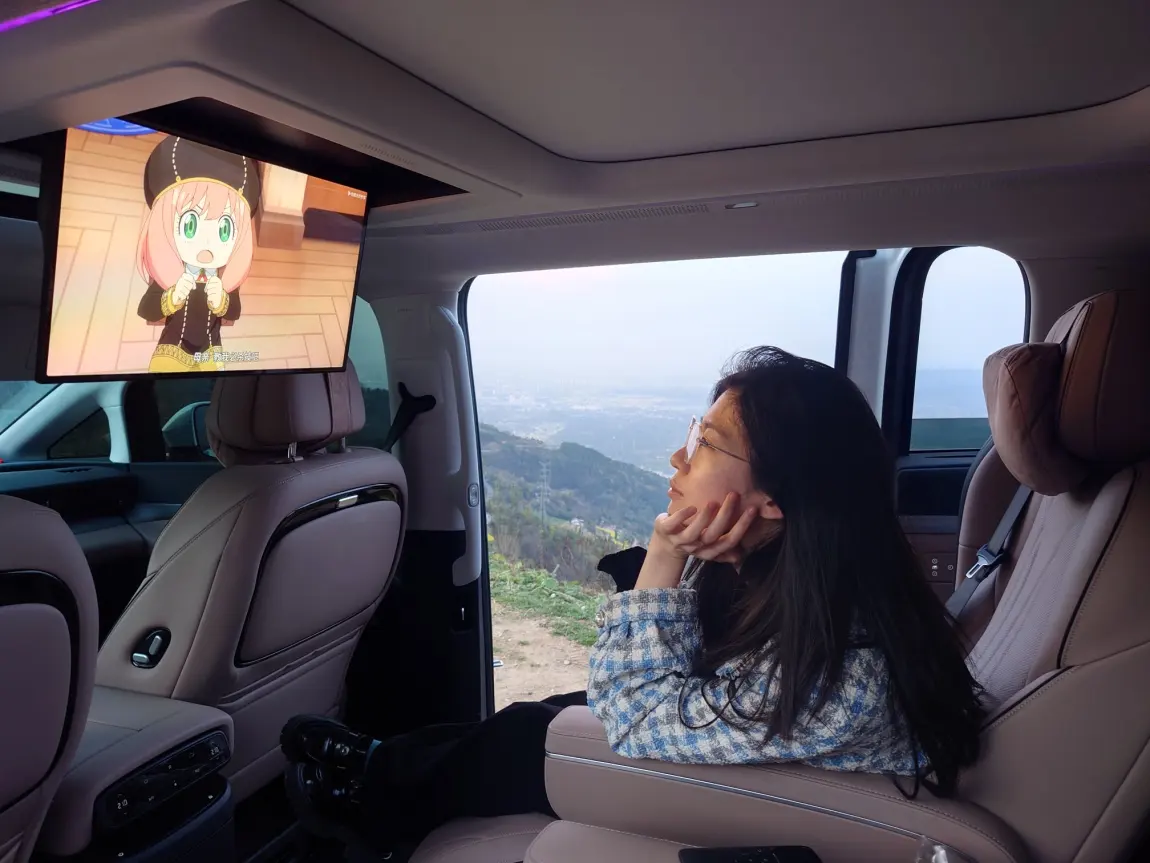 但X9最戳我的,是它把“车”变成了“移动的家”。后排放倒就是1.8米的大床,今年露营、长途自驾时,我在车里睡了7次:裹着粉被子看车顶屏播《间谍过家家》,氛围灯调成淡紫色,窗外是山风或者城市夜景——这哪是开车,明明是把生活装在了车轮上。