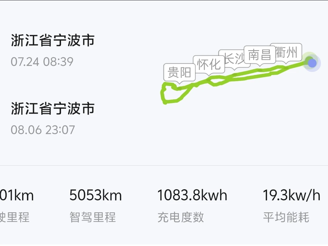 宁波—衢州—南昌—长沙—怀化—黔东南—贵阳—毕节织金县—百里画廊化屋风景区—阿西里西大草原—六盘水—乌蒙大草原—黔西南州兴义市—马岭河峡谷—万峰湖—万峰林下纳灰村—黔南州罗甸县大小井景区—黔东南州镇远古城—黔东南州施秉县杉木河漂流—湖南邵阳市—江西宜春市—鹰潭市—浙江金华义乌市—宁波。行程 5300 公里。