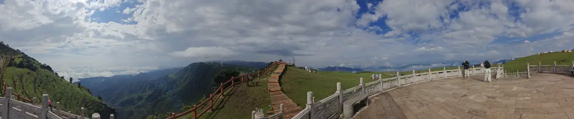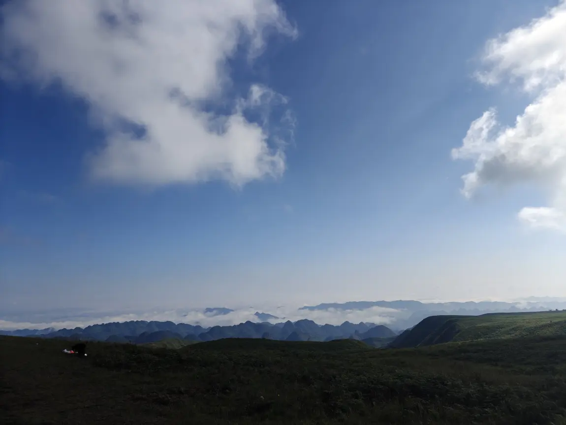 7.30 下山兴发乡羊肉粉早餐后前往六盘水。六盘水市区过于破旧遂决定前往乌蒙大草原。盘山山腰鸡场镇吃烤鱼,在八担山村转弯上山免门票。在大草原过夜,大雨滂沱,雷电交加。环境温度 16 度。早晚很冷。 早上 7 时 起床时大雨,搭帐篷吃泡面,9 时许又大雨。云海极美。下山。