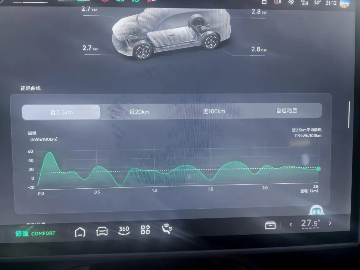 小鹏的电耗控制是非常的不错的。上下班正常行驶的情况下。电耗只有12~13左右。领先同级。