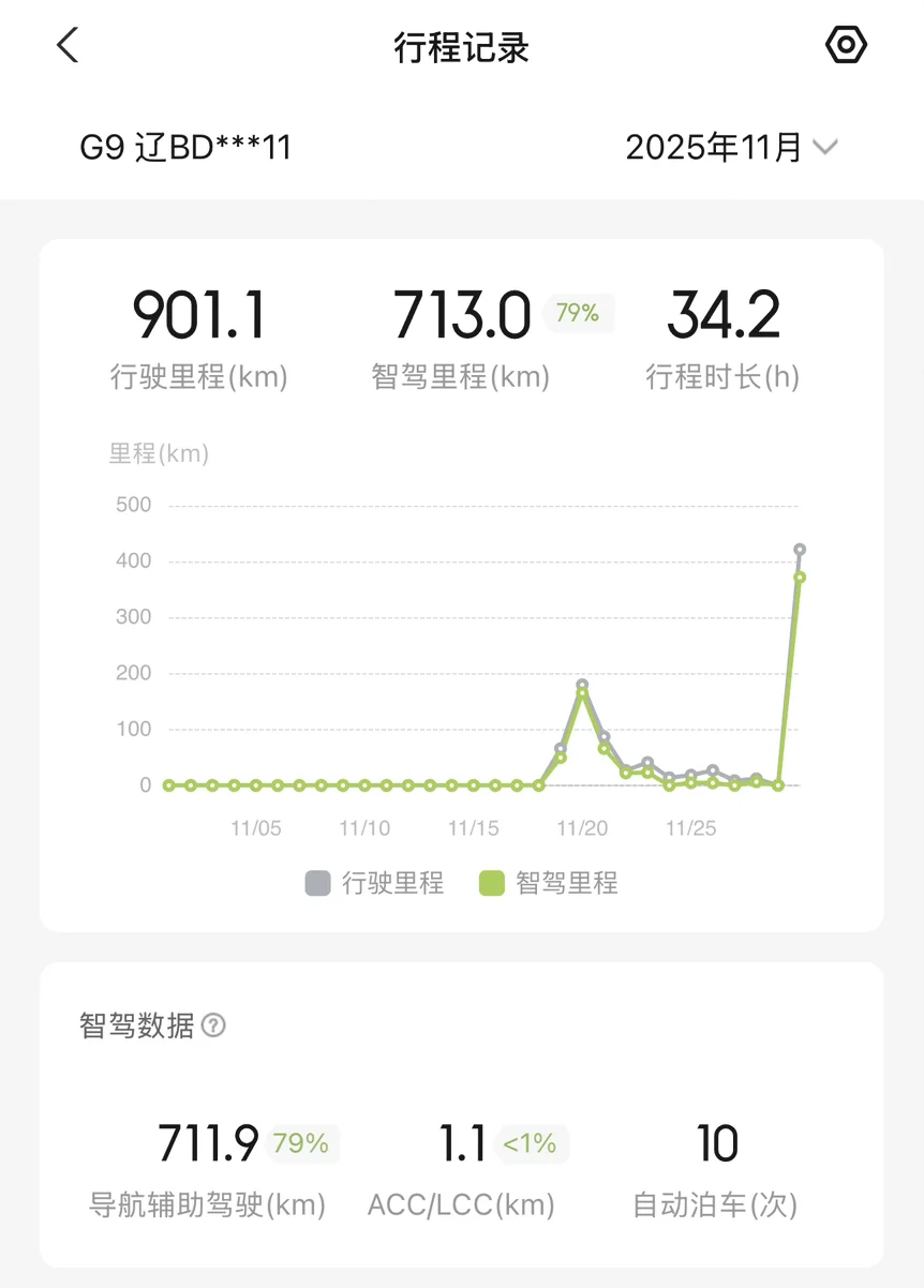 回溯这两十余日的行程数据,11月里,901.1公里的行驶轨迹勾勒出初识爱车的探索之路,其中713.0公里的智驾里程占比高达79%,彼时导航辅助驾驶便已贡献了711.9公里的“智慧里程”,ACC/LCC与10次自动泊车的尝试,更像是一场对科技好奇心的初次试探,34.2小时的行程时长里,每一次方向盘后的松弛,都藏着对智能系统的试探性信任。