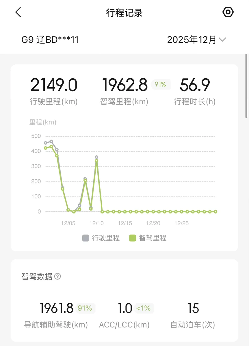 而踏入12月,这份信任便如滚雪球般膨胀。2149.0公里的行驶里程背后,是1962.8公里的智驾里程占比飙升至91%,导航辅助驾驶几乎包揽了1961.8公里的路程,ACC/LCC的微量使用与15次自动泊车的进阶,更像是技术磨合后的默契选择,56.9小时的行程时长里,车辆的智能系统俨然成了最可靠的“副驾”。