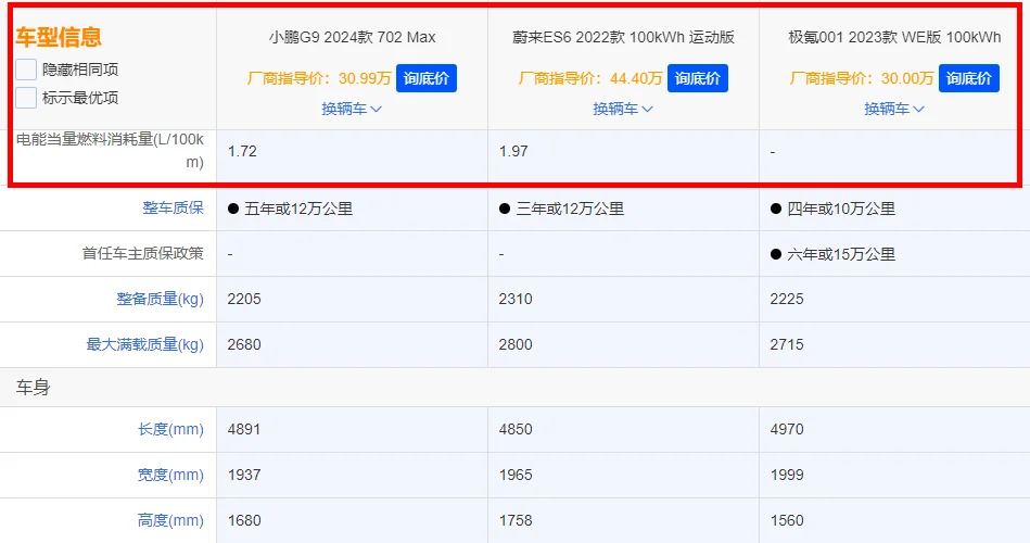 G9中大型SUV整备质量2吨多,鹏厂的电池、电机和电控技术真不错,百公里能耗很低。
