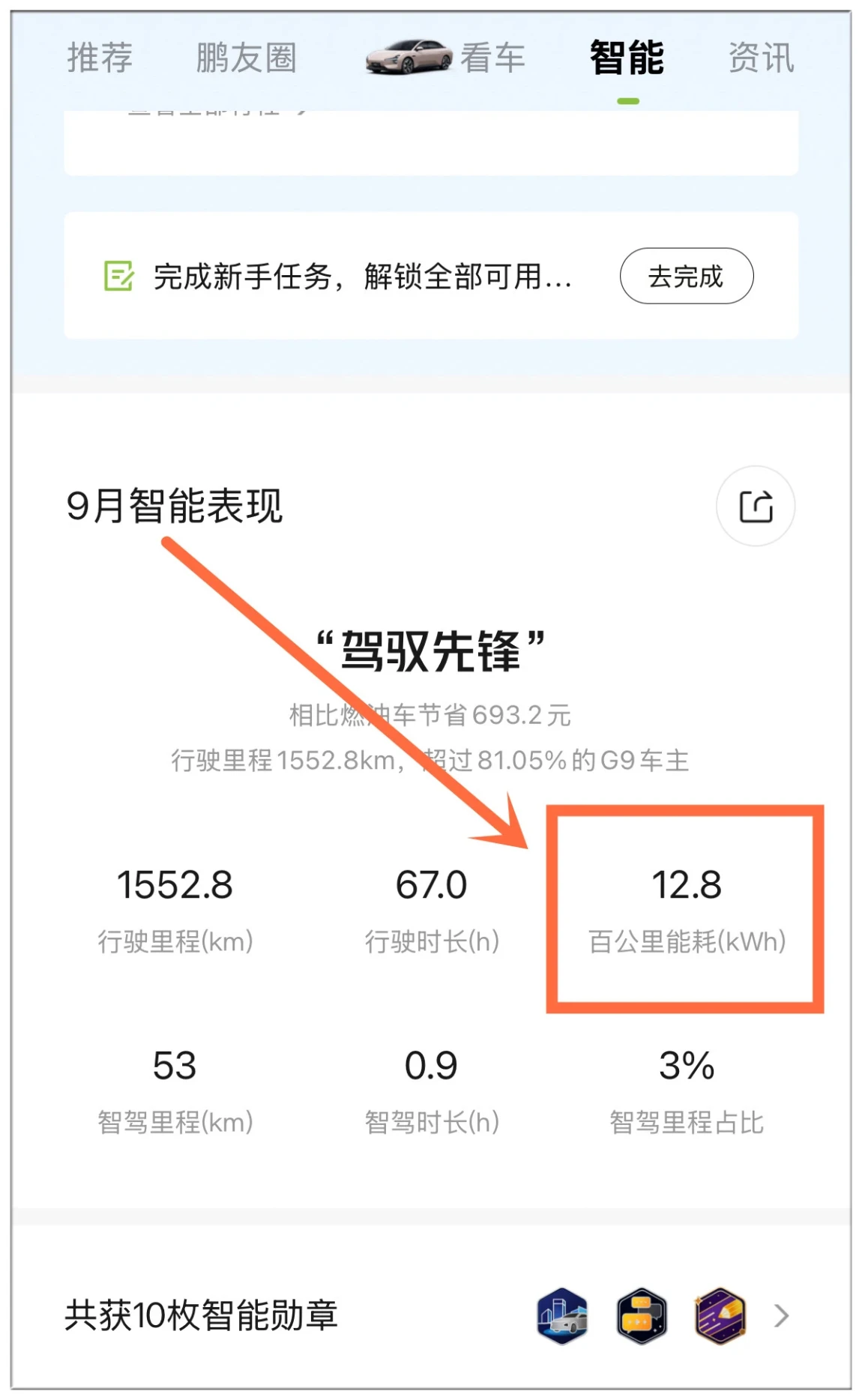没有开电动车前,我是有里程焦虑的。开上G9后,我再也没有任何焦虑。因为小鹏汽车的续航达成率轻松上85%以上。我的G9是702公里版本,平常充电90%时,硬续航足足的WLTP-513公里。