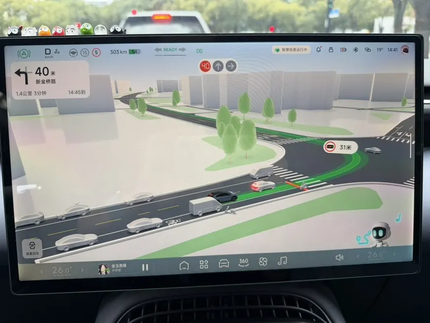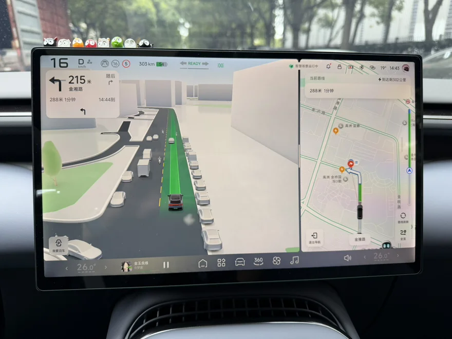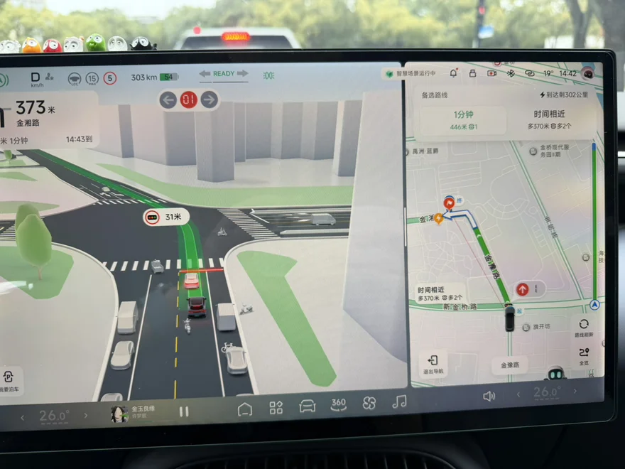 心心念念的车道级导航终于来了!而且是和SR渲染深度整合的!页面上可以清楚的看到车道分布、道路划线和标识,还有推荐行驶车道,周围环境的渲染也非常精致,配色看着很舒服。原本SR上的信息也一样没少,周围的车子、红绿灯的状态都还在。有了车道级导航之后,配合AR HUD上的路线显示,真正把分屏App的优势发挥出来了,右半边放个音乐、视频App也不干扰。