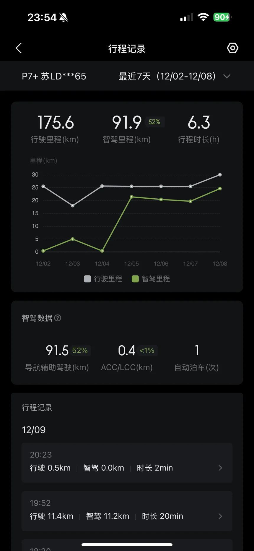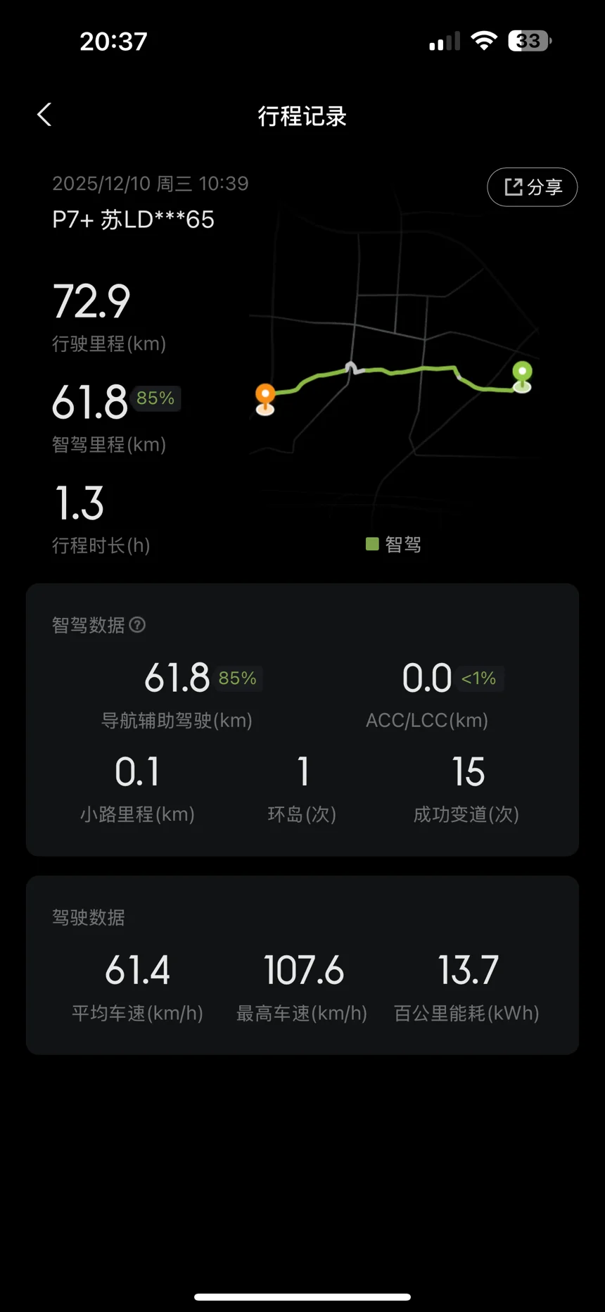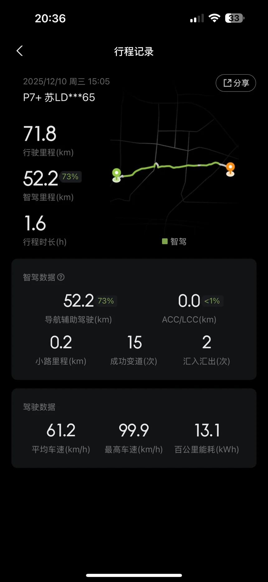 翻了翻小鹏P7+年度出行数据,扬州野生动物园、南京红山动物园都留下过我们的足迹。12月气温降到12℃左右,开着座椅加热和方向盘加热,再配上NGP辅助驾驶,跑高速或镇江到南京的快速路(最高100码)超省心,辅助驾驶占用率超70%。70多公里路程,最低能耗才13,高速平均能耗也才15,这表现真的太给力了!