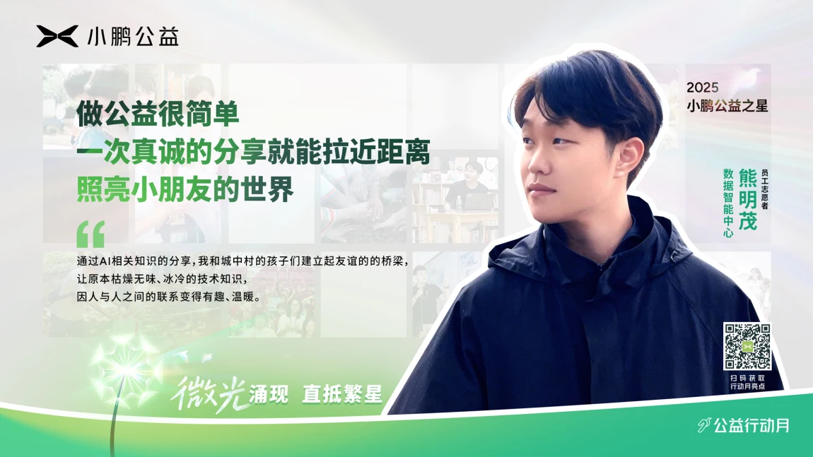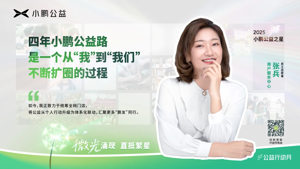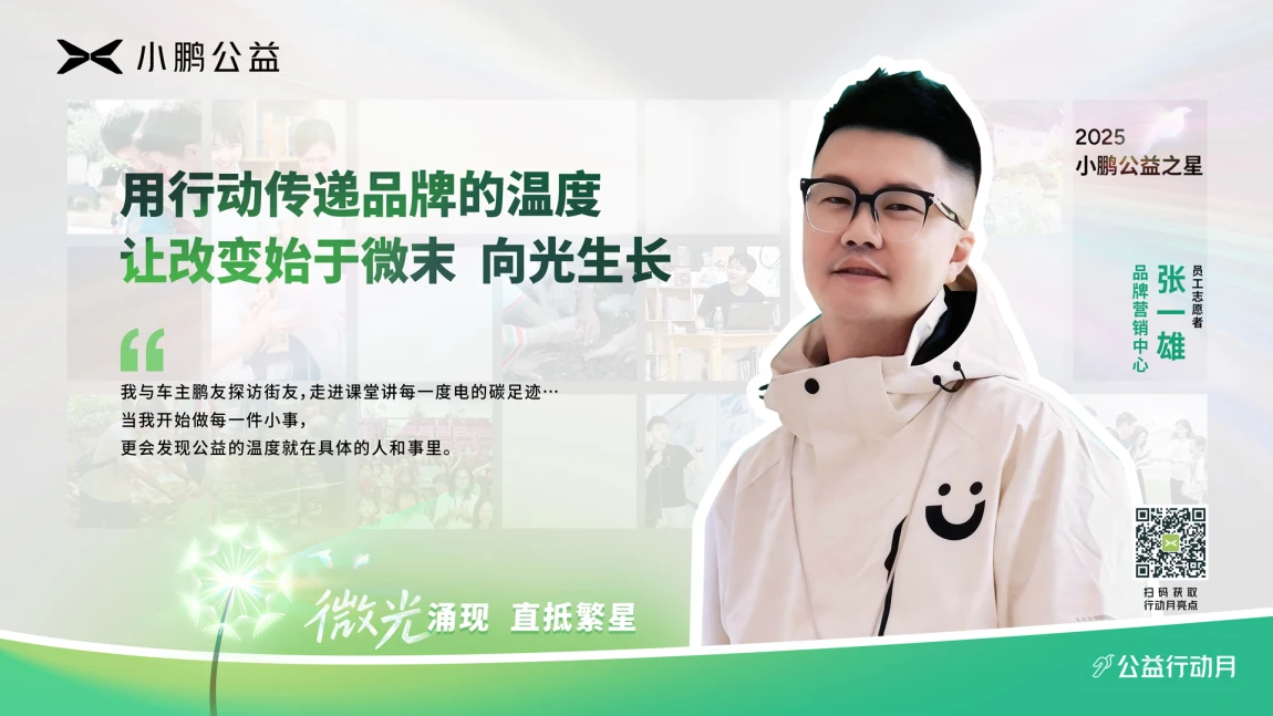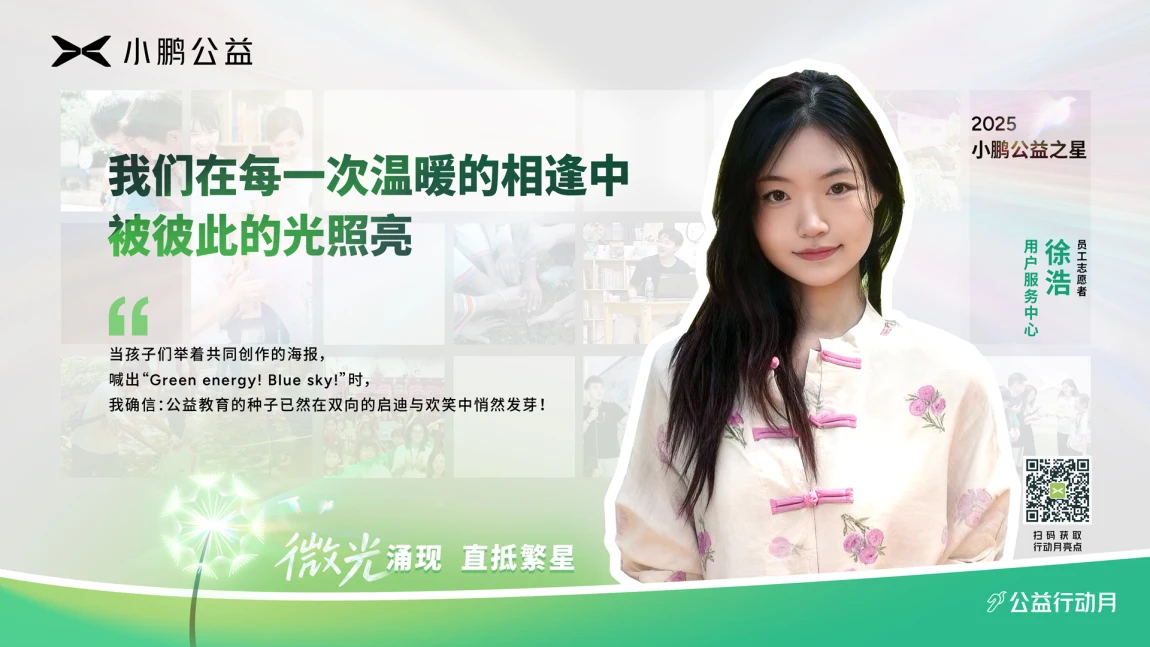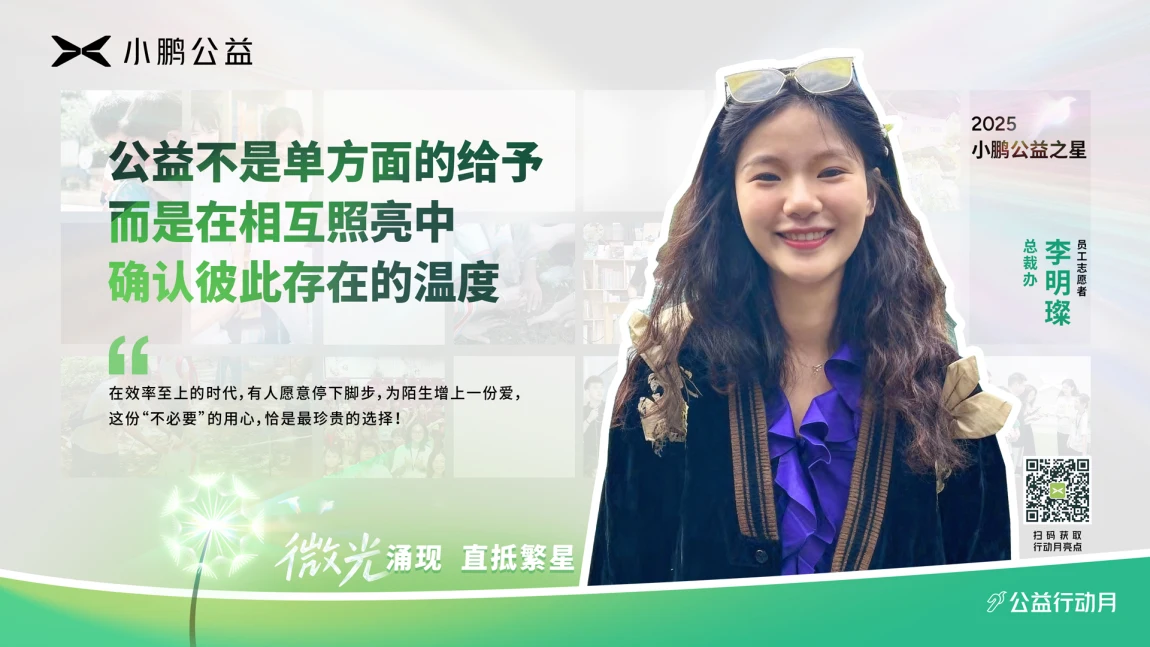 小鹏公益志愿者将志愿服务与工作、爱好、技能相联结,让公益成为一件一件可感、可行的身边事。更多公益之星的故事正在路上,等待被听见、被回应,在微光中激起向善的涟漪。