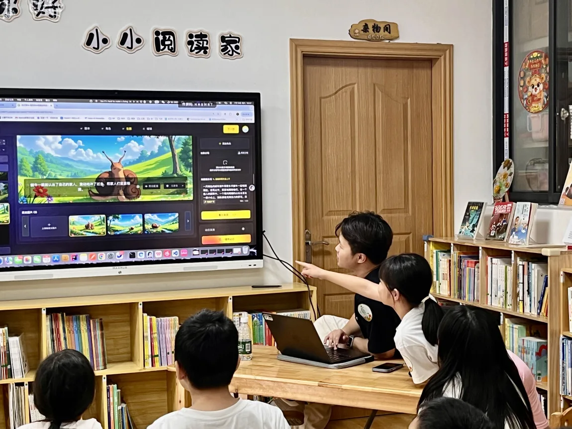 出生在教师家庭的小熊,对“教育工作”有着特别的情感。受邀成为AI科普课讲师后,他花费1个小时与项目人员沟通,详细了解社区基本情况。为了让孩子们感受到AI技术的魅力和边界,小熊决定“用AI讲故事”。他提前与机构负责人深入沟通,针对孩子们的年龄特点和知识储备为他们量身定制课程方案。通过与孩子们一起共创童话故事,灵活展现AI的文本、图像与视频生成能力。以生动的案例告诉孩子:“AI不是冷冰冰的机器,而是帮助我们实现美好的工具。每个创意,都可能改变世界”。