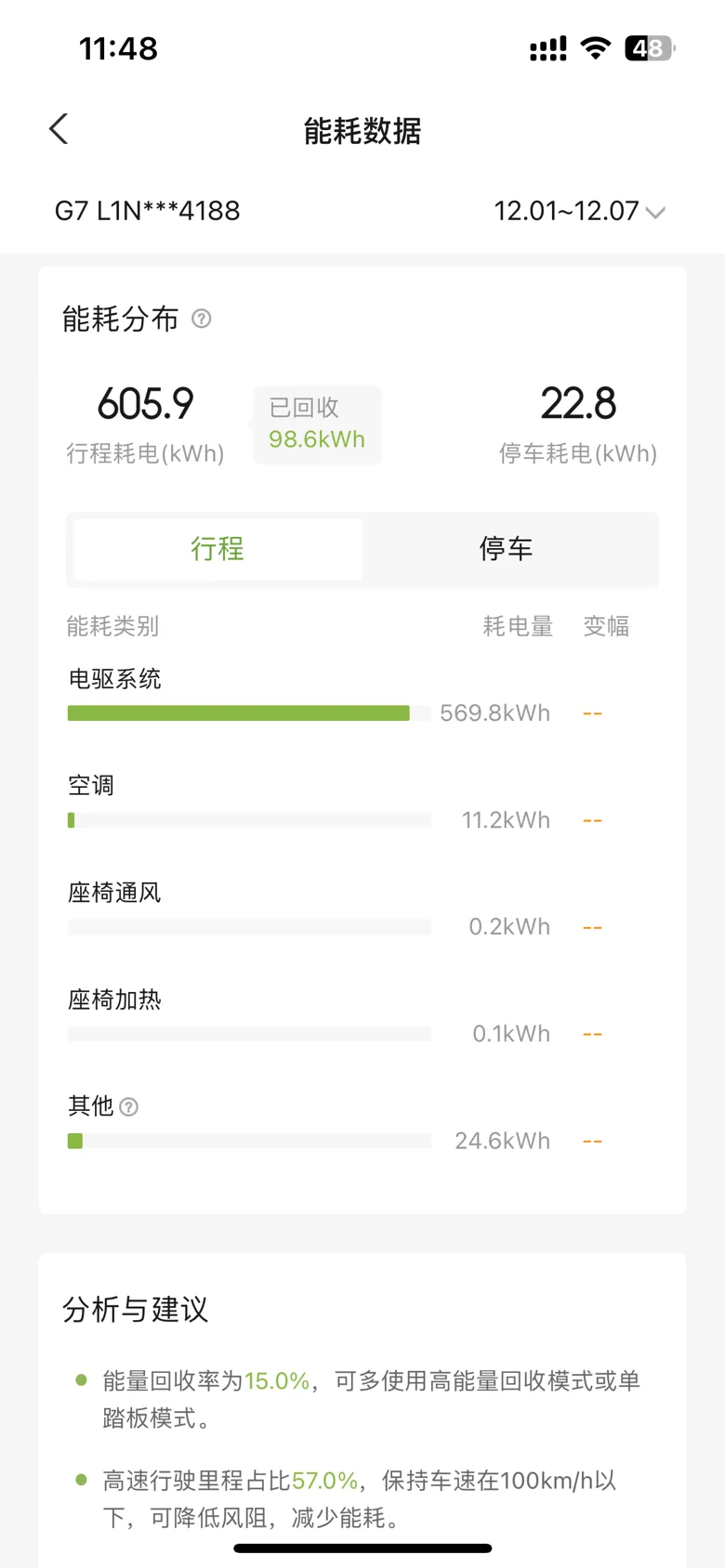 还有能耗构成这块,我也瞅了瞅:电驱系统占了94%的耗电,空调才用了11.2度,空调我是来回全程都开着23度最低风速。不得不说G7的热泵空调是真给力,北方冬天开暖风也没咋费电。停车耗电22.8度,占比3.6%,在服务区睡过两次觉,也是不下电开空调,电池保温这些损耗还能接受。