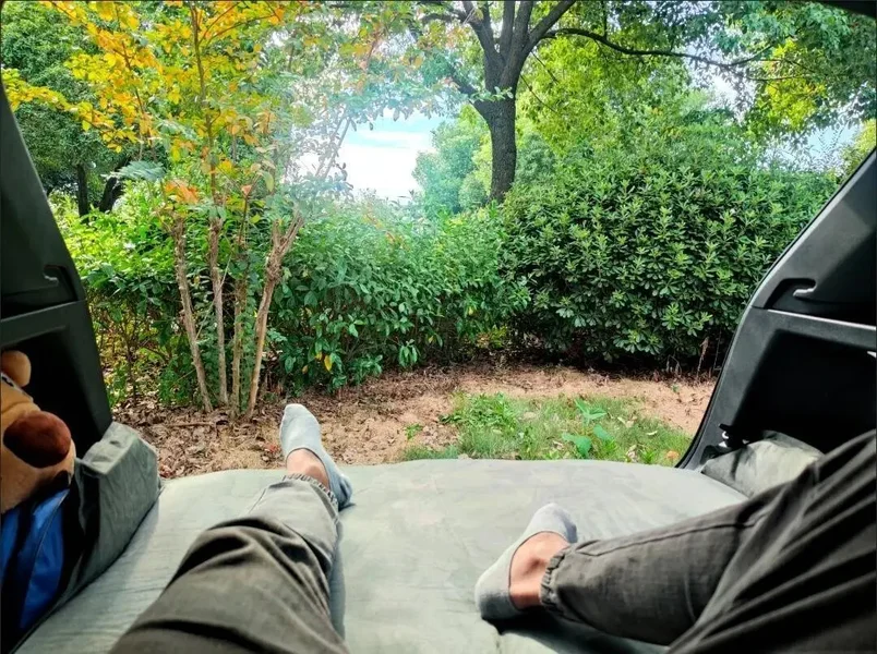 购买了车载床垫,这在冬日的旅途中显得尤为实用。我可以舒适地在车内过夜,开启暖气,享受一个温暖的夜晚。停在山路边,感受大自然的惬意。