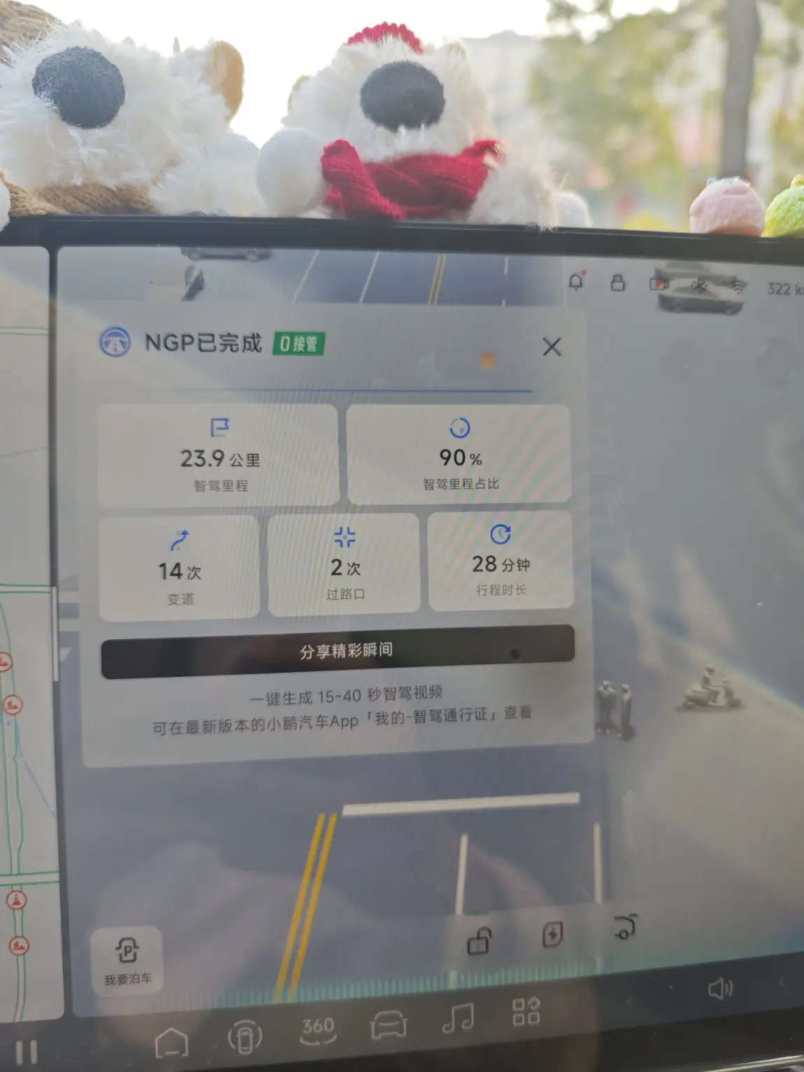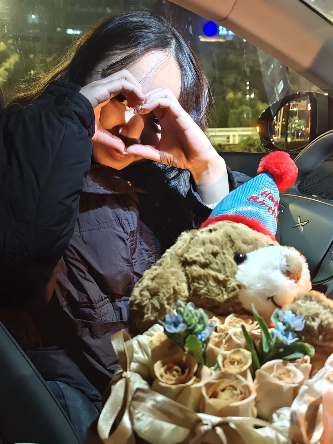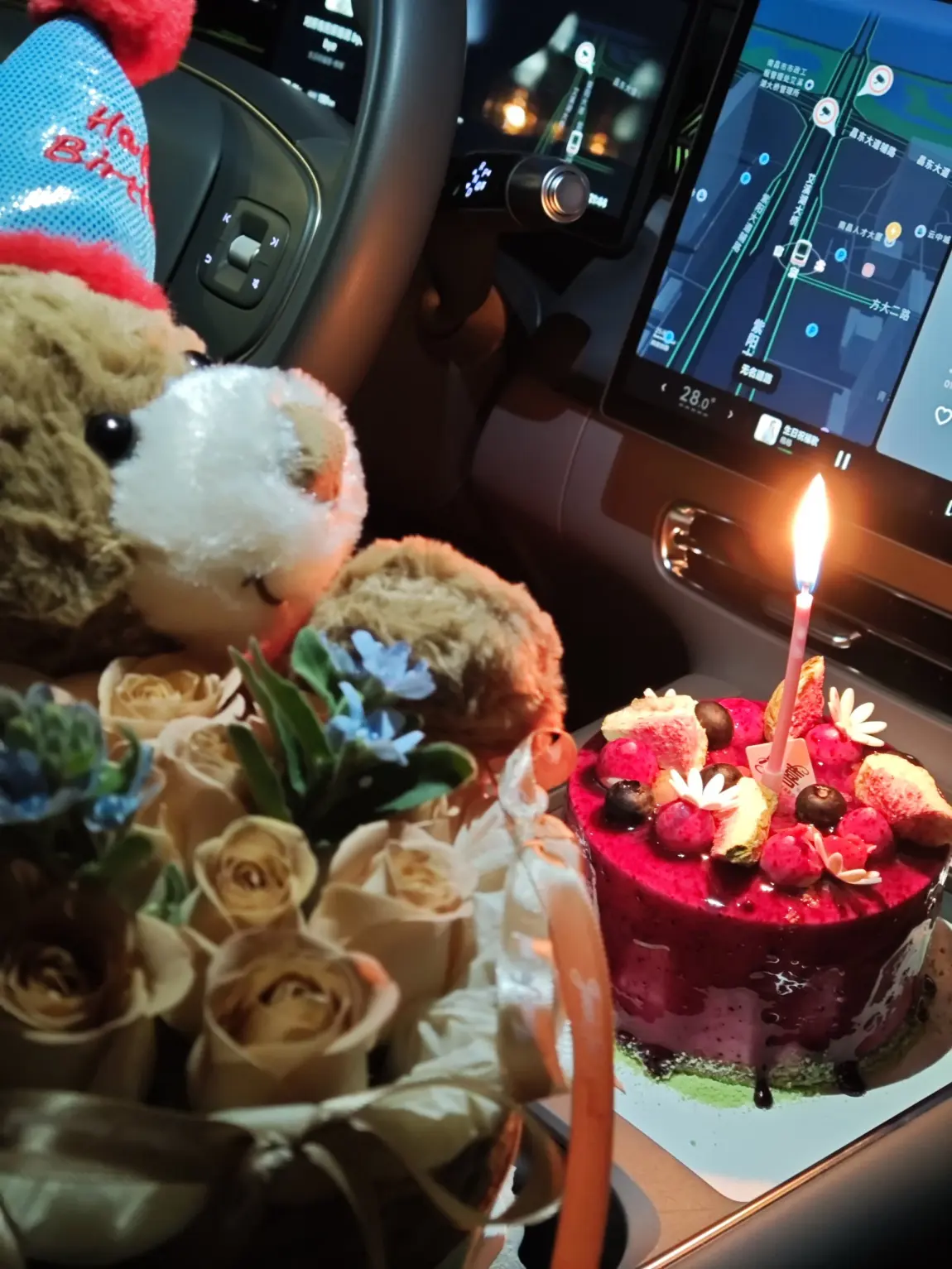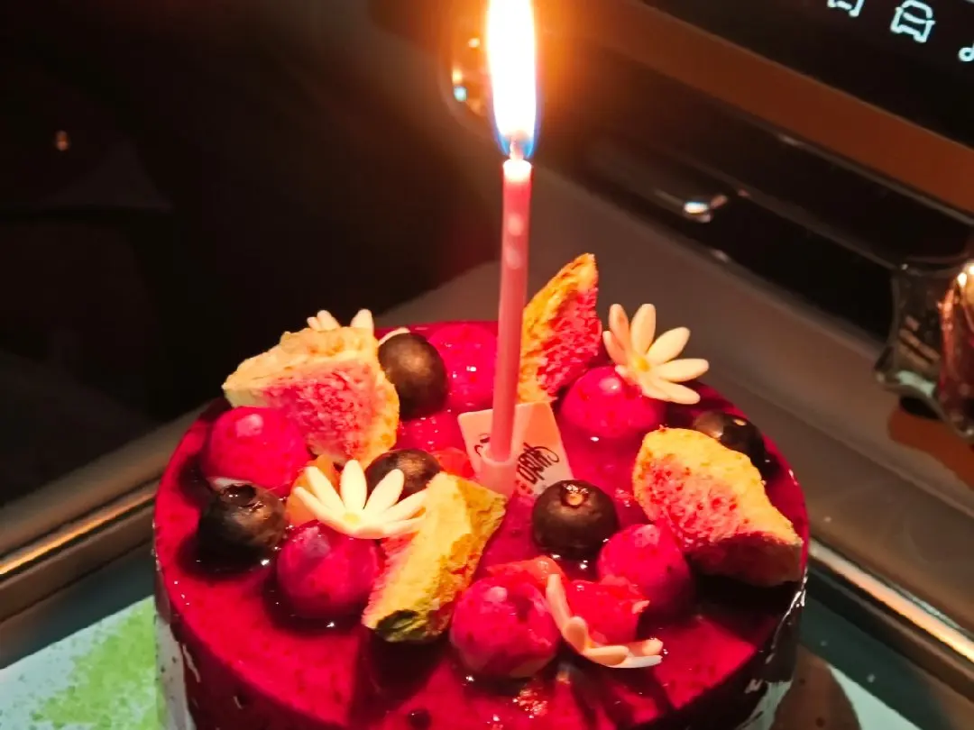 那天农历十月初三,是工作日,碰巧我还要加班。在工作中一度忘记今天是自己的生日,在我晚上九点半下班准备开小P回家时,我的打开车门居然有一个插着蜡烛的蛋糕,车机放着生日快乐歌,而我的对象抱着一束花看着我。我不知道什么来形容当时的状态…她说家里有爸妈,外面店里过生日很社恐,只有在小鹏车里最合适了,有超大空间,唯美的氛围灯,车内音响又很好,而且关起车窗之后超级静谧。