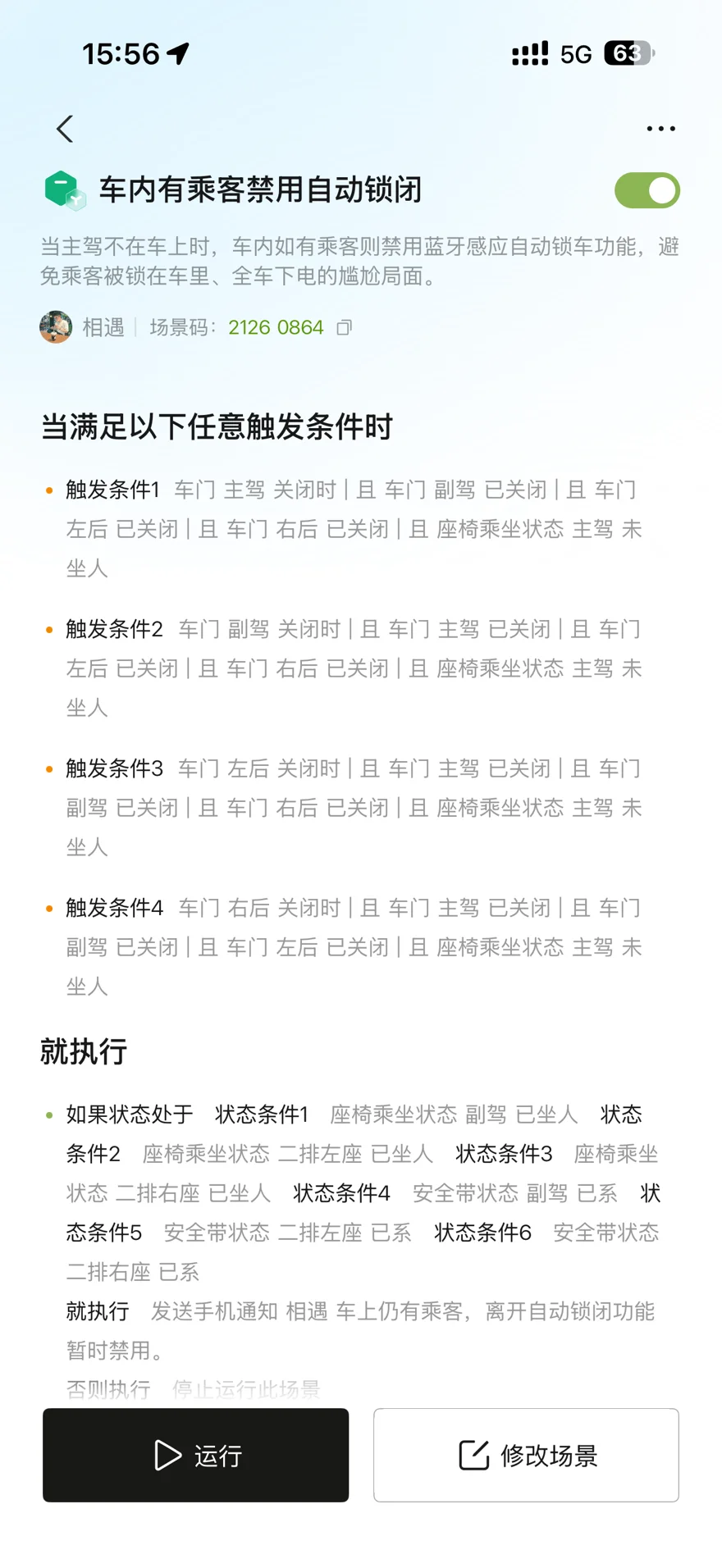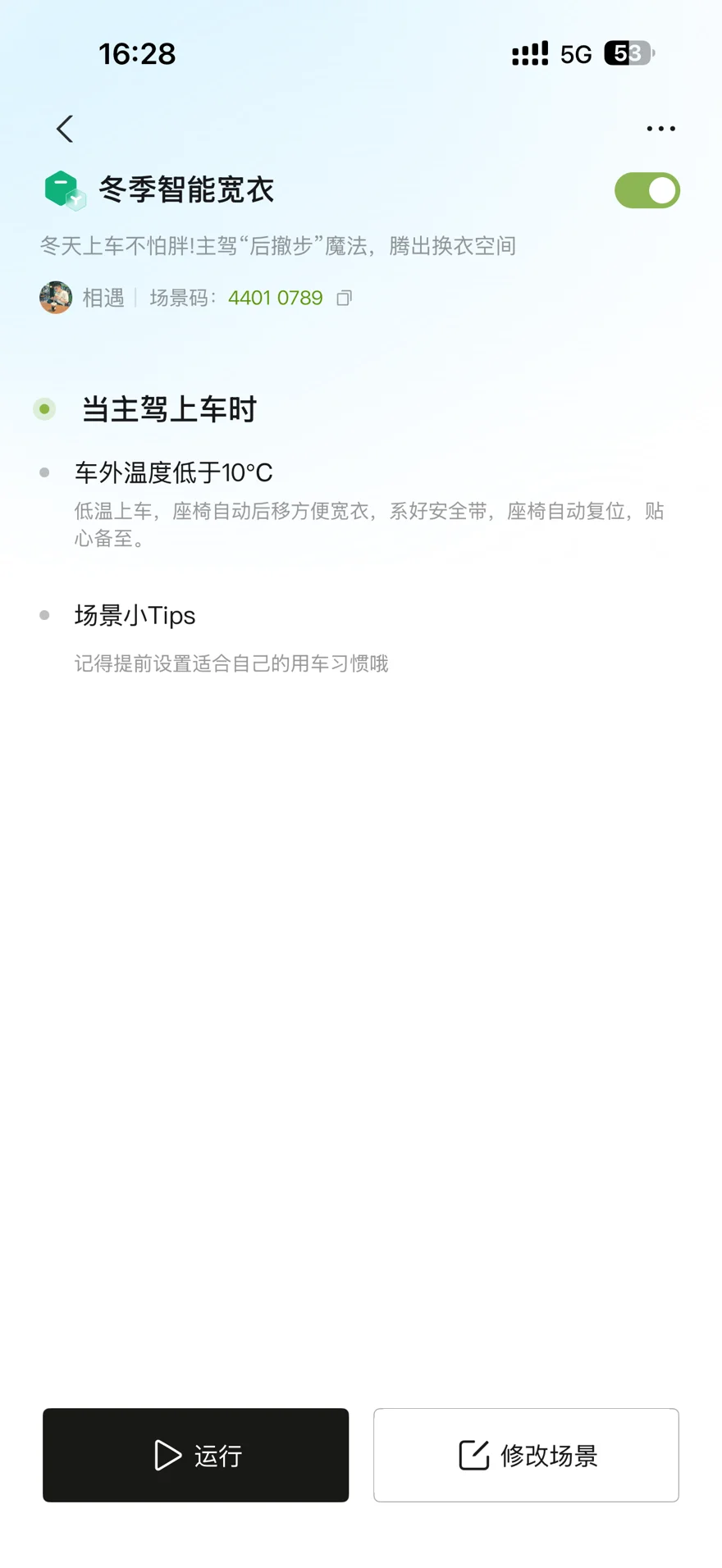 我一搬早上8点10分出门,所以设置的是工作日早上8点自动远程备车,当温度低于15度时,他会帮你打开车辆空调并调整到一个舒适的温度,并且场景时间也不会特别长,正常十分钟就会自动关闭,这样我一上车车里就会特别暖和,再也不用担心冻屁股了