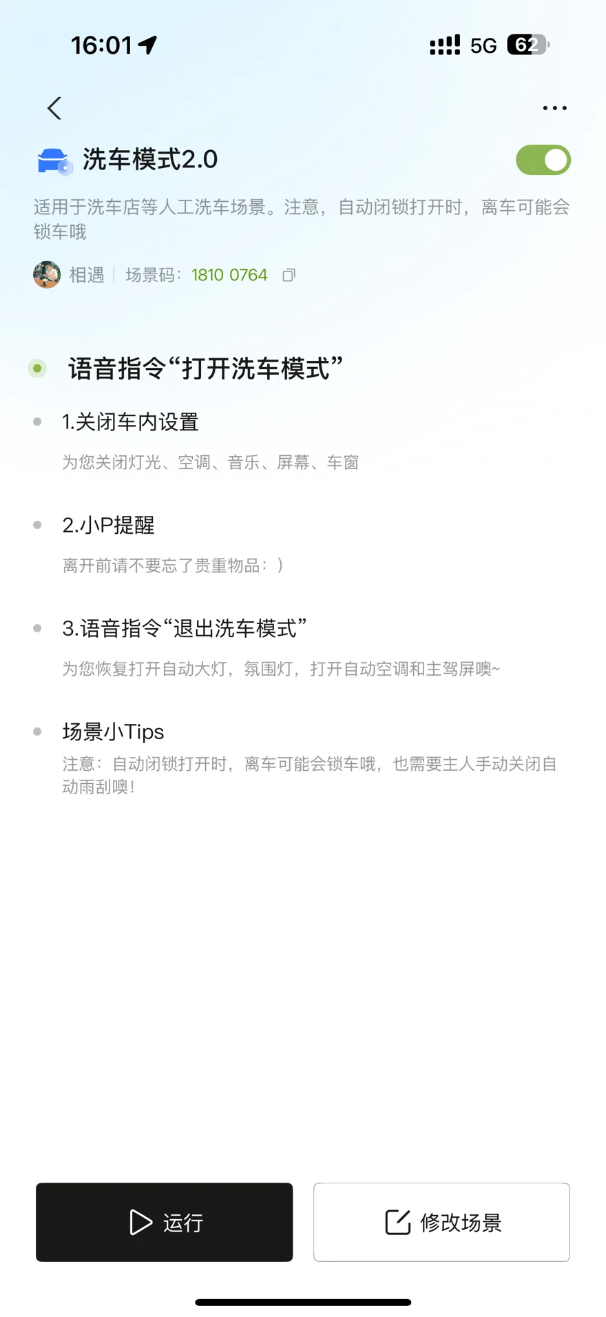 当我们去洗车的时候,只需要跟小p说一声打开洗车模式,他就会帮你自动关闭全车车窗、灯光、空调、音乐、屏幕之类的,并且还会语音提醒你不要忘记贵重物品,再也不用一个个去操作了,省了很多麻烦,不过这个模式下需要手动去关闭自动锁车和自动雨刮功能