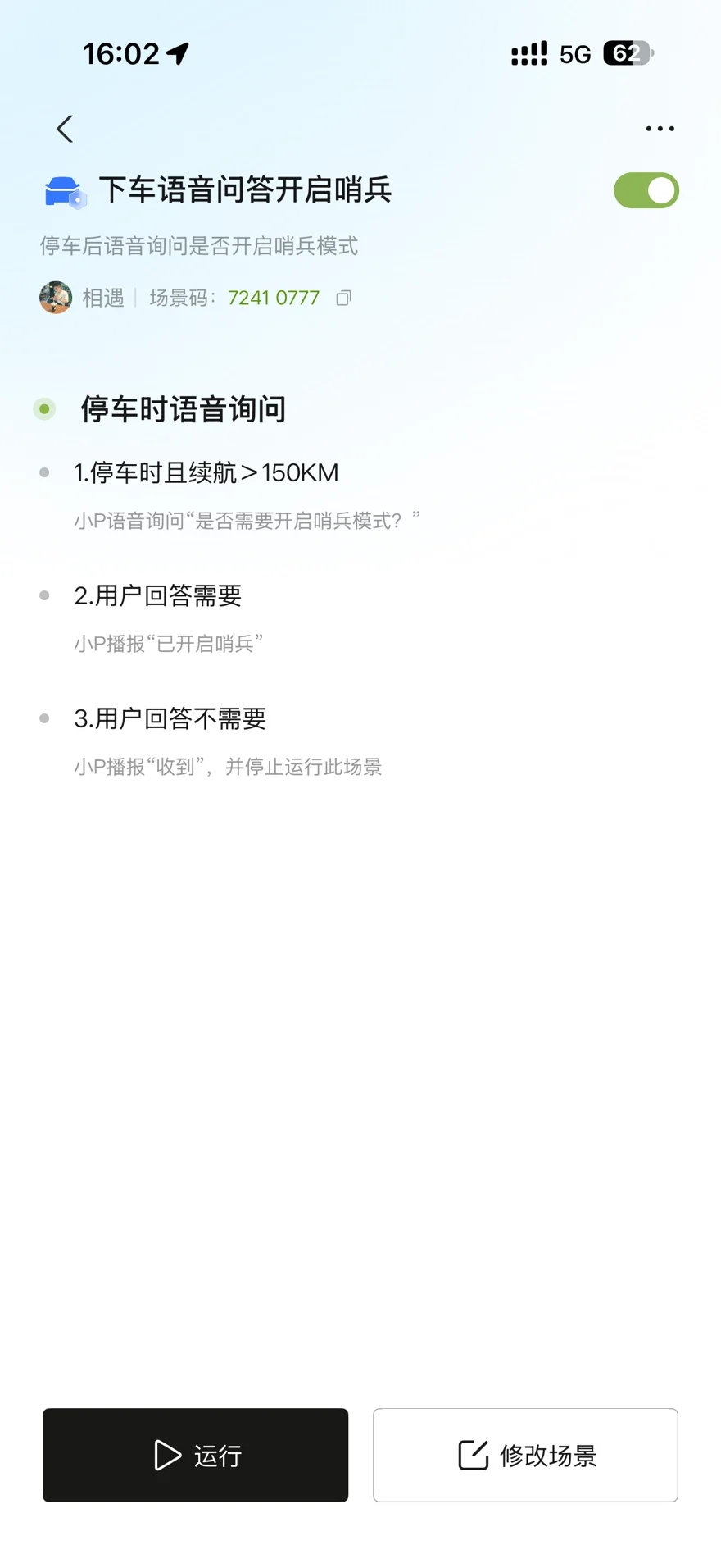 这个场景在车辆停车后且续航超过150公里时,你解开安全带就会主动询问你是否需要开启哨兵模式,你只要跟他说需要或者不需要,省去了手动操作的麻烦,而且哨兵真的特别实用,唯一缺点就是比较耗电