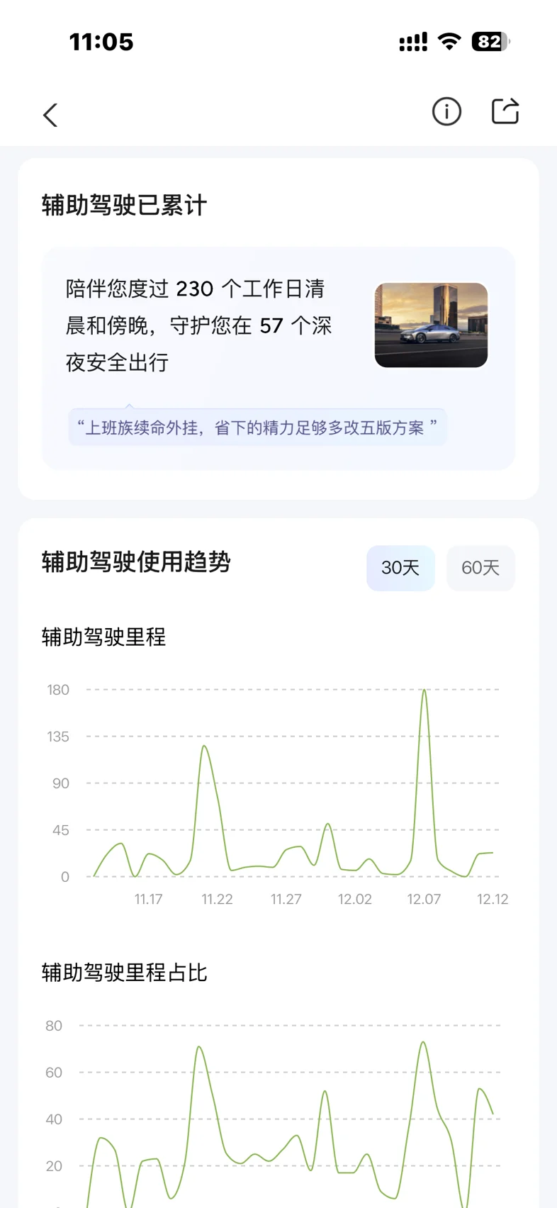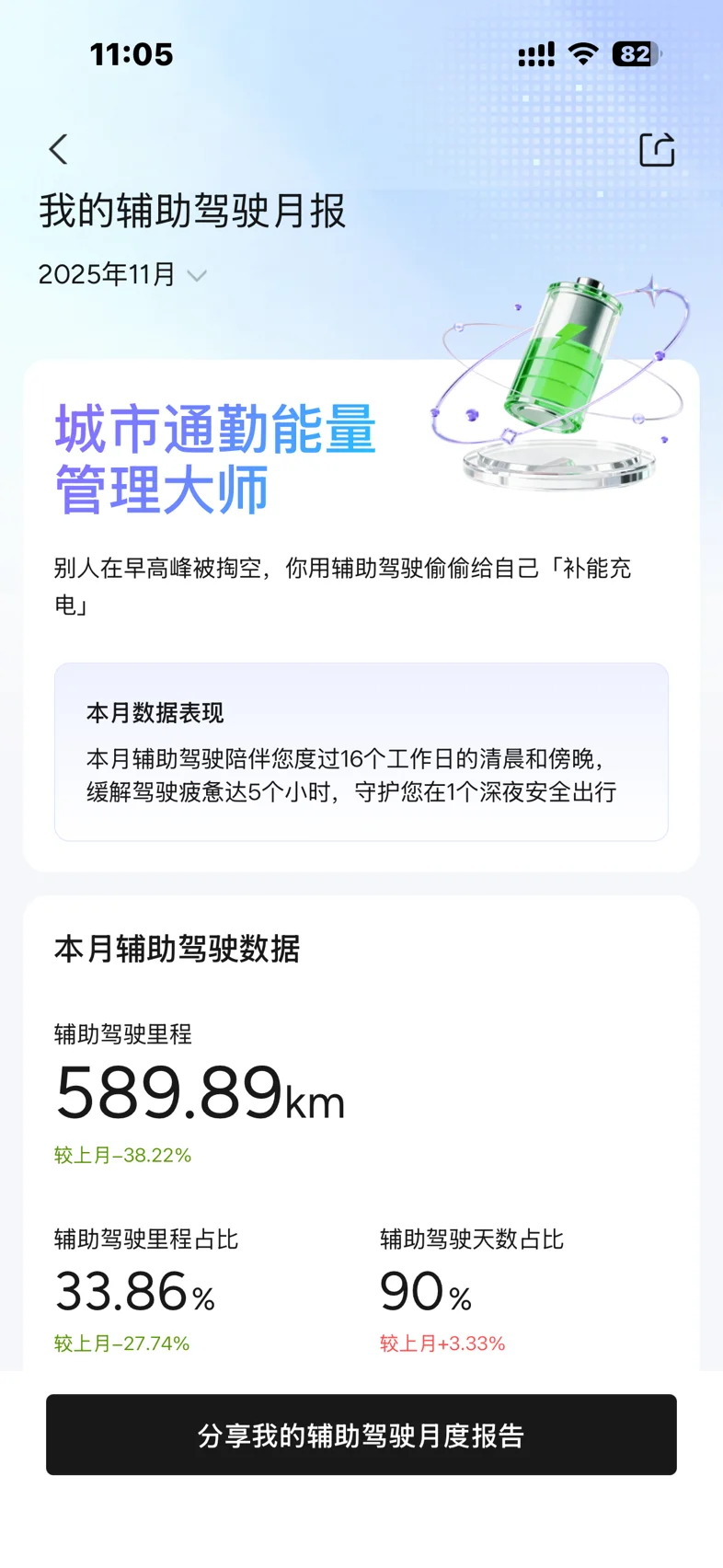 本月辅助驾驶陪伴度过16个工作日的早晚通勤时段,累计缓解驾驶疲惫时长达5小时,还守护了1次深夜安全出行。辅助驾驶里程为589.89km,较上月下降38.22%;里程占比33.86%(较上月降27.74%),但使用天数占比提升至90%(较上月涨3.33%),可见虽单次使用里程减少,但使用频次依旧较高,成为城市通勤的“能量管理助手”。