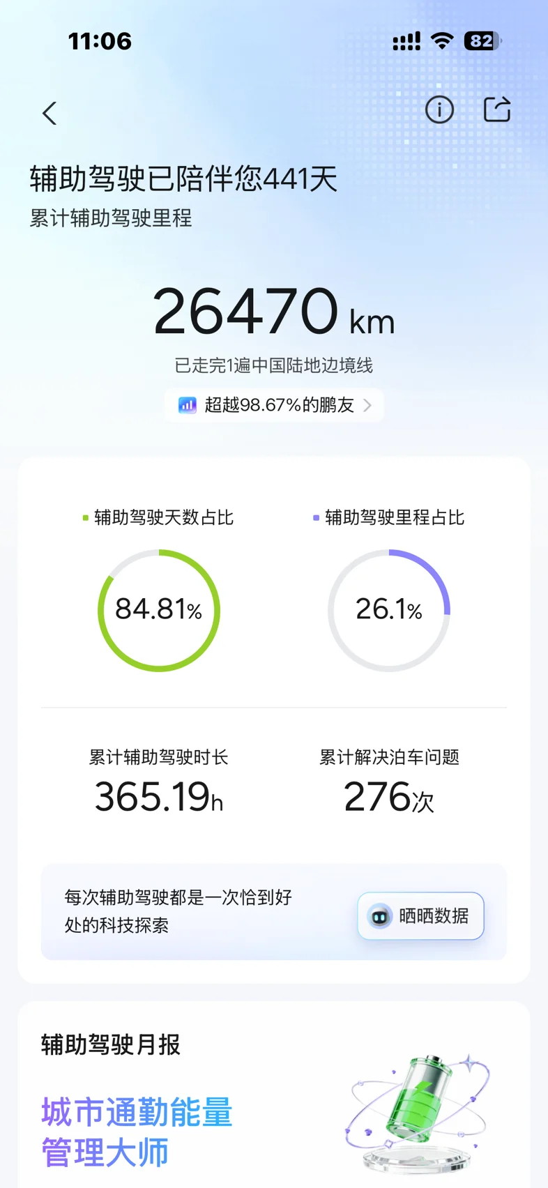 截至目前,辅助驾驶已陪伴441天,累计里程达26470km,超越98.67%的用户;累计辅助驾驶时长365.19小时,还通过辅助驾驶解决了276次泊车问题,长期使用下辅助驾驶已成为出行中不可或缺的科技助力。