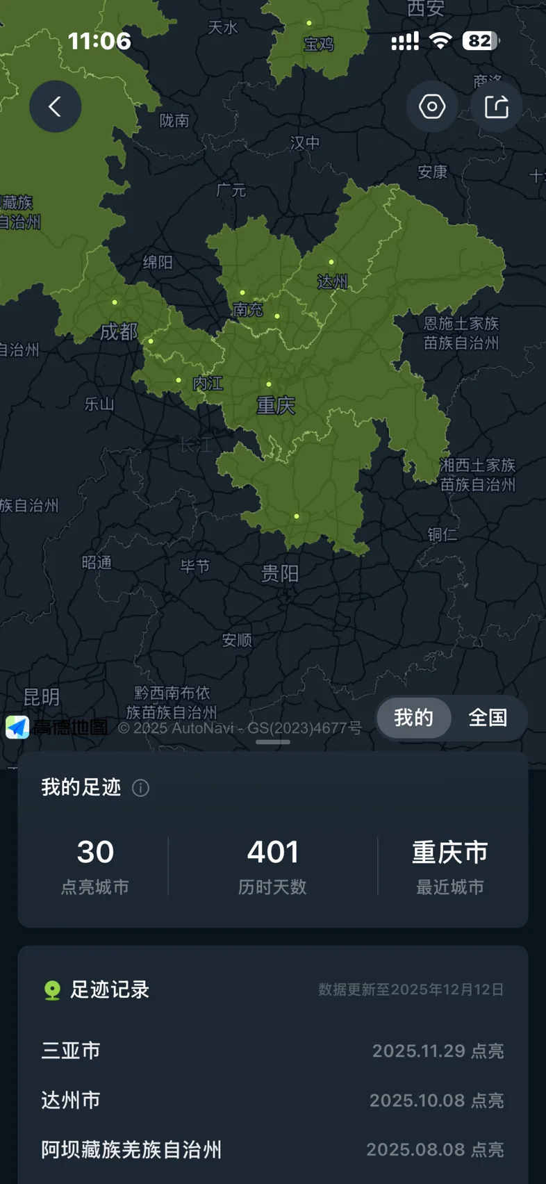 11月用车足迹实现新突破,2025年11月29日点亮三亚市,至此累计点亮城市数量达到30个,最近常出行城市为重庆市,401天的用车历程里,足迹覆盖范围持续扩大。