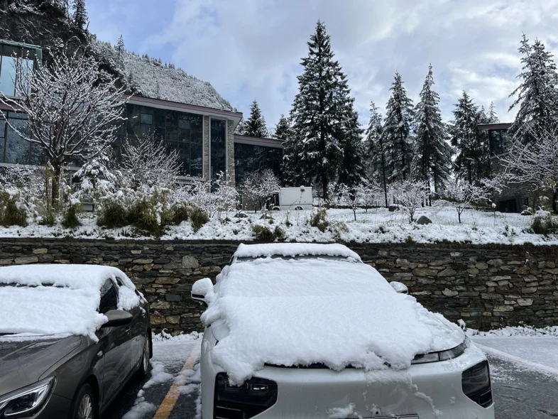 驶入川西高原,风景陡然换了模样。原本苍翠的山林覆上了皑皑白雪,公路像一条黑色的丝带,缠绕在银装素裹的山间。行至毕棚沟时,一场初雪刚过,天地间白茫茫一片,松枝挂着雪团,溪流结着薄冰,母亲忍不住让我停车,她走到雪地里,伸手接住飘落的雪花,像个孩子般笑着说:“这辈子第一次见这么厚的雪。”我打开小鹏G9的对外放电功能,煮了一壶热茶,母子俩倚着车,看着雪山在阳光下熠熠生辉,热茶的暖意混着身边人的笑容,成了这个冬天最柔软的瞬间。小鹏G9的雪地模式格外靠谱,在结冰的盘山路上,车辆的抓地力和稳定性让我完全不担心,稳稳地载着我们穿梭在冰雪秘境里。
