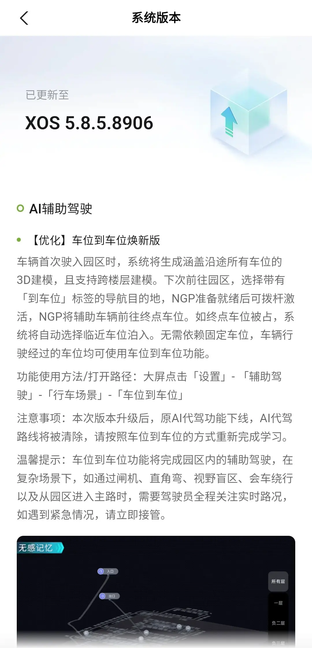 那天早晨上车,屏幕提示可以升级至XOS5.8.8.8906新版本。升级后,我发现了全新的智能泊车辅助、更流畅的语音交互、更强大的NGP。这让我意识到:我的P7+在与我一同成长。传统汽车从出厂就开始贬值,而智能汽车却通过OTA不断增值——这不只是一次升级,而是一次“焕新”。