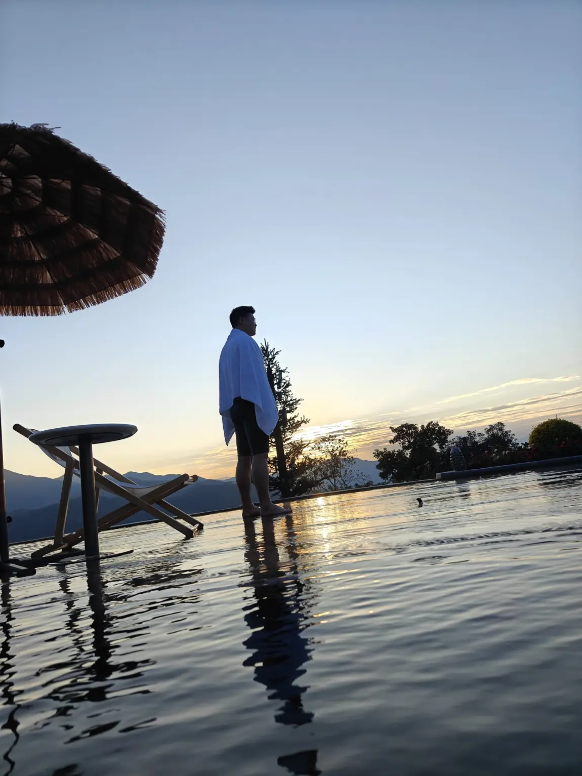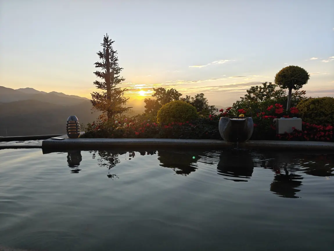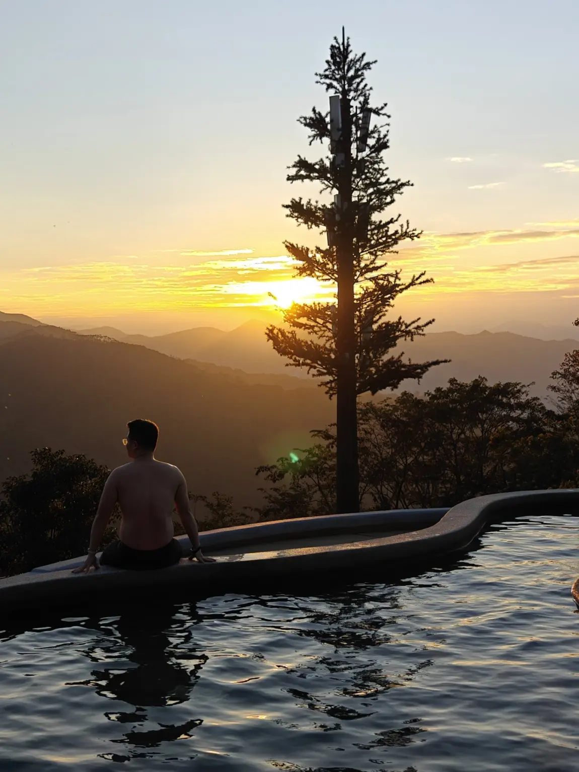 山顶的无边温泉池太美了,我们就没有意识到,从山脚下泡上去,差点错过日落,所以来得晚还是得从山顶上往下泡!