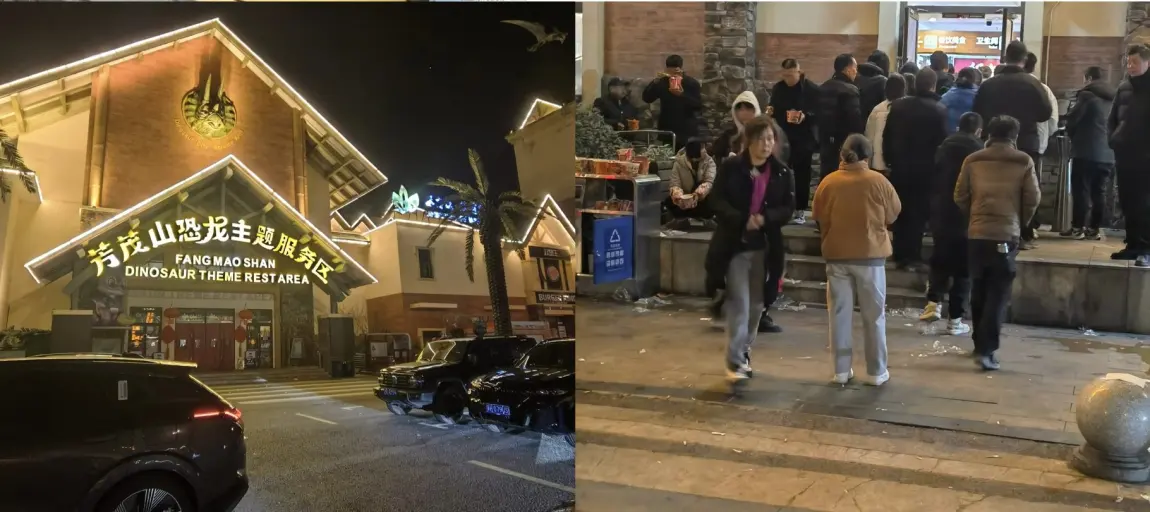 然后就直奔上海,初七最后一天,路上那叫一个堵。只能在半路在服务区过夜了,居然还是一个恐龙主题服务区,半夜上厕所都得排队啊。第一次睡在小鹏X9的车里,三人不挤,把空调一开,倍儿暖和。