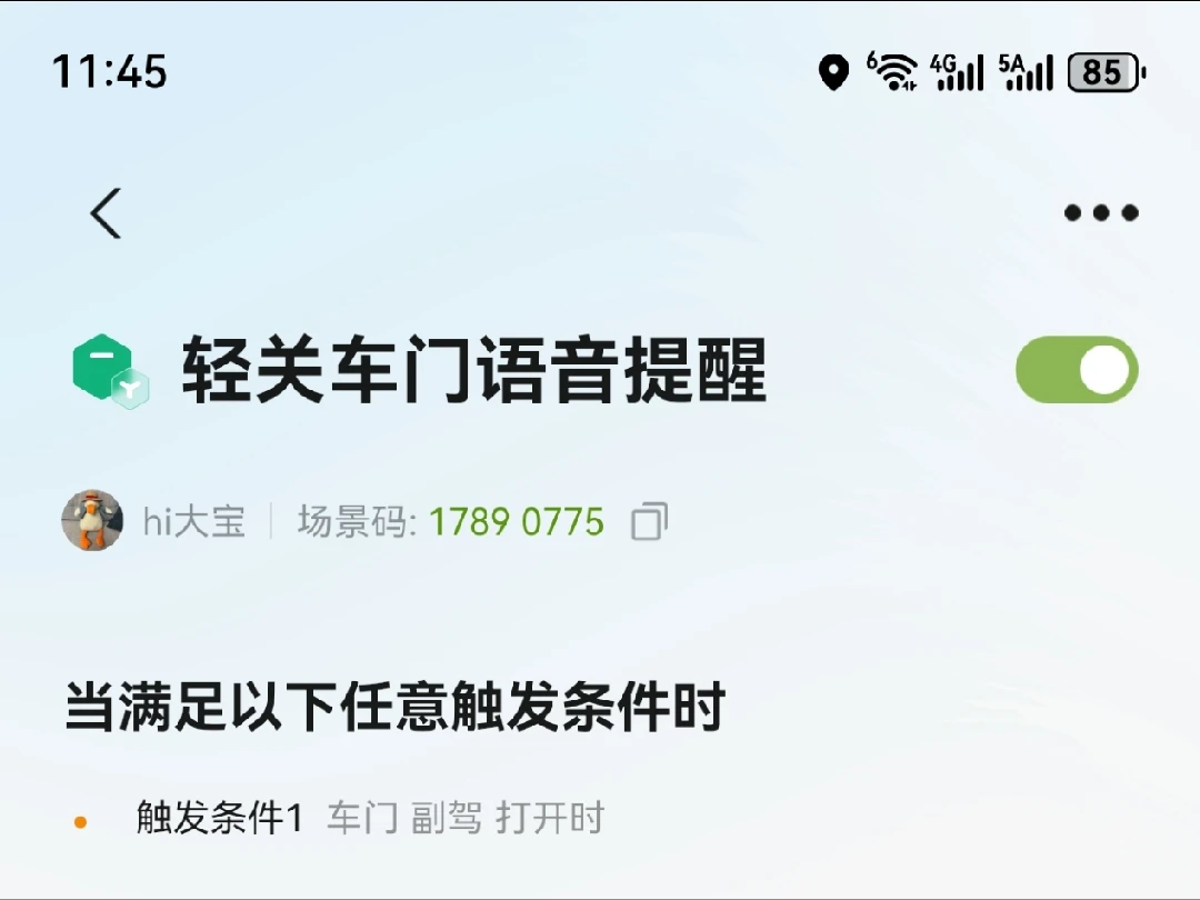 因为是电吸门,担心用力关门影响电吸效果,所以在智能场景里搜相关场景码,自动提醒乘客轻关车门,但是没搜到,所以自己搞了一个,分享给有需要的鹏友们。